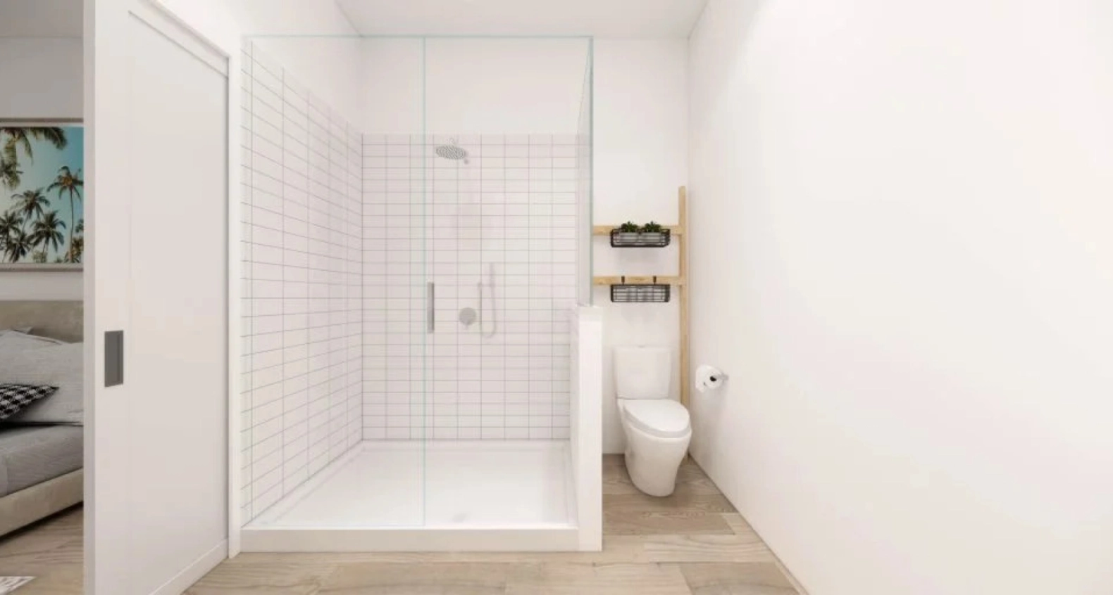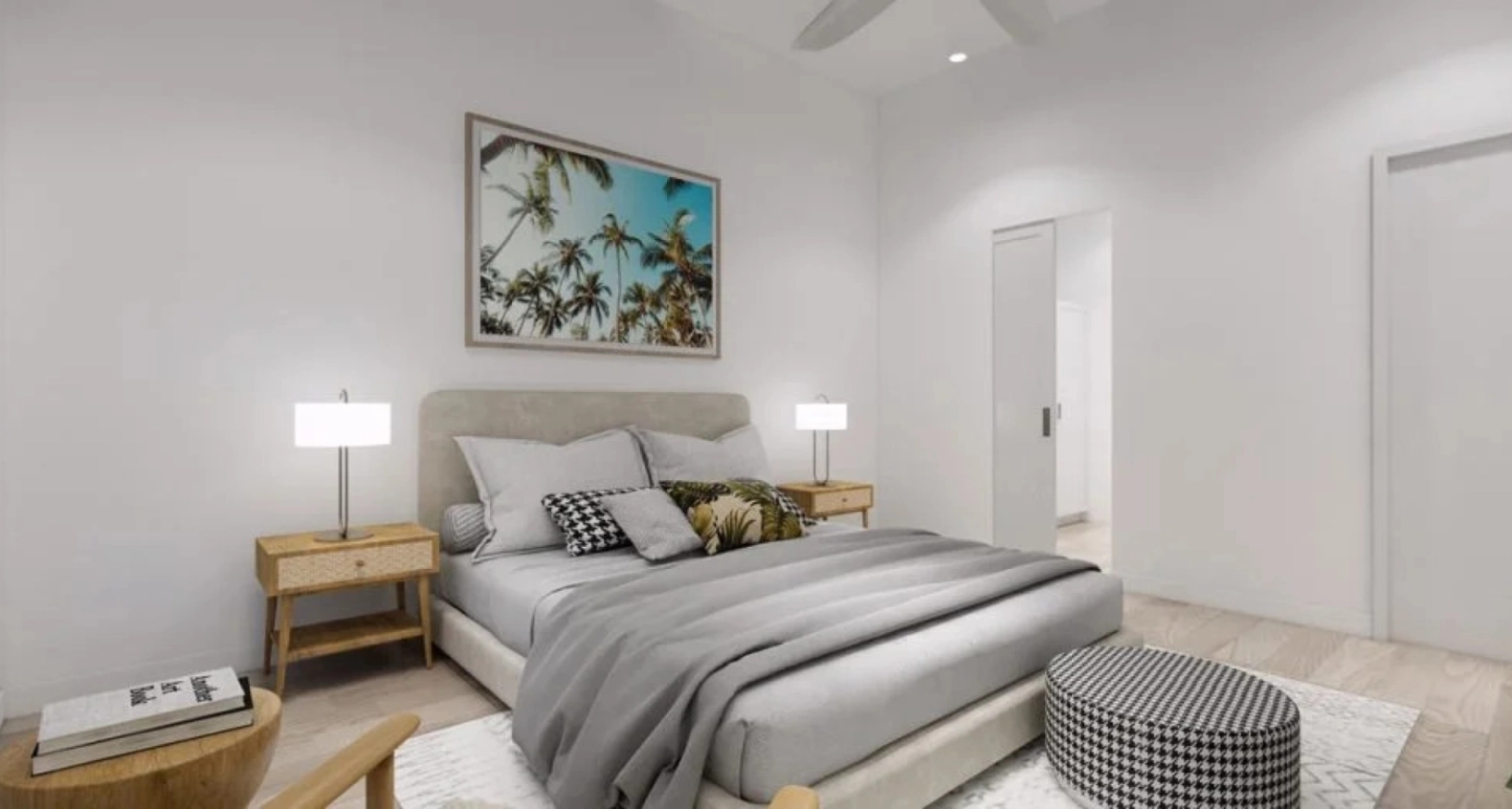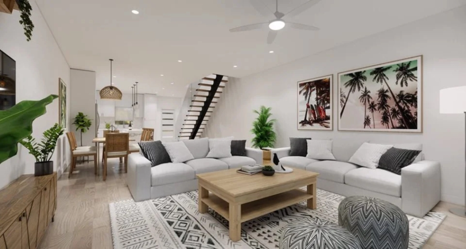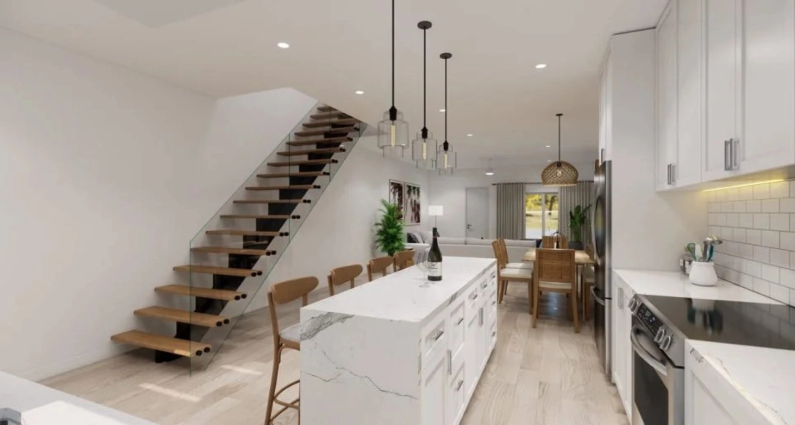 Unit 10 is a two-level townhouse featuring two en-suite bedrooms upstairs and an open-plan living and kitchen area on the ground floor, complete with a convenient half bathroom. The kitchen, set on elegant porcelain or ceramic tile flooring, will be outfitted with shaker-style cabinetry, quartz or granite countertops, modern LED lighting, and sleek stainless steel appliances.