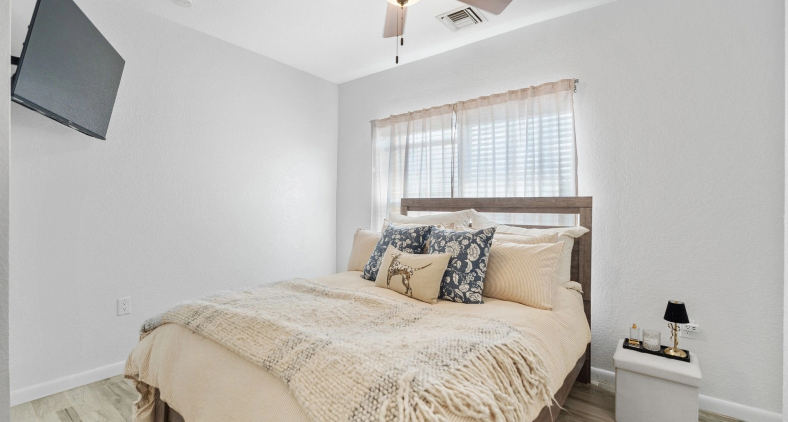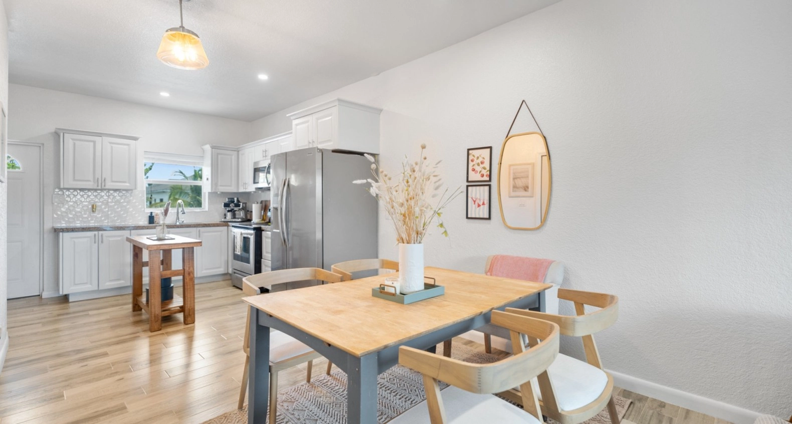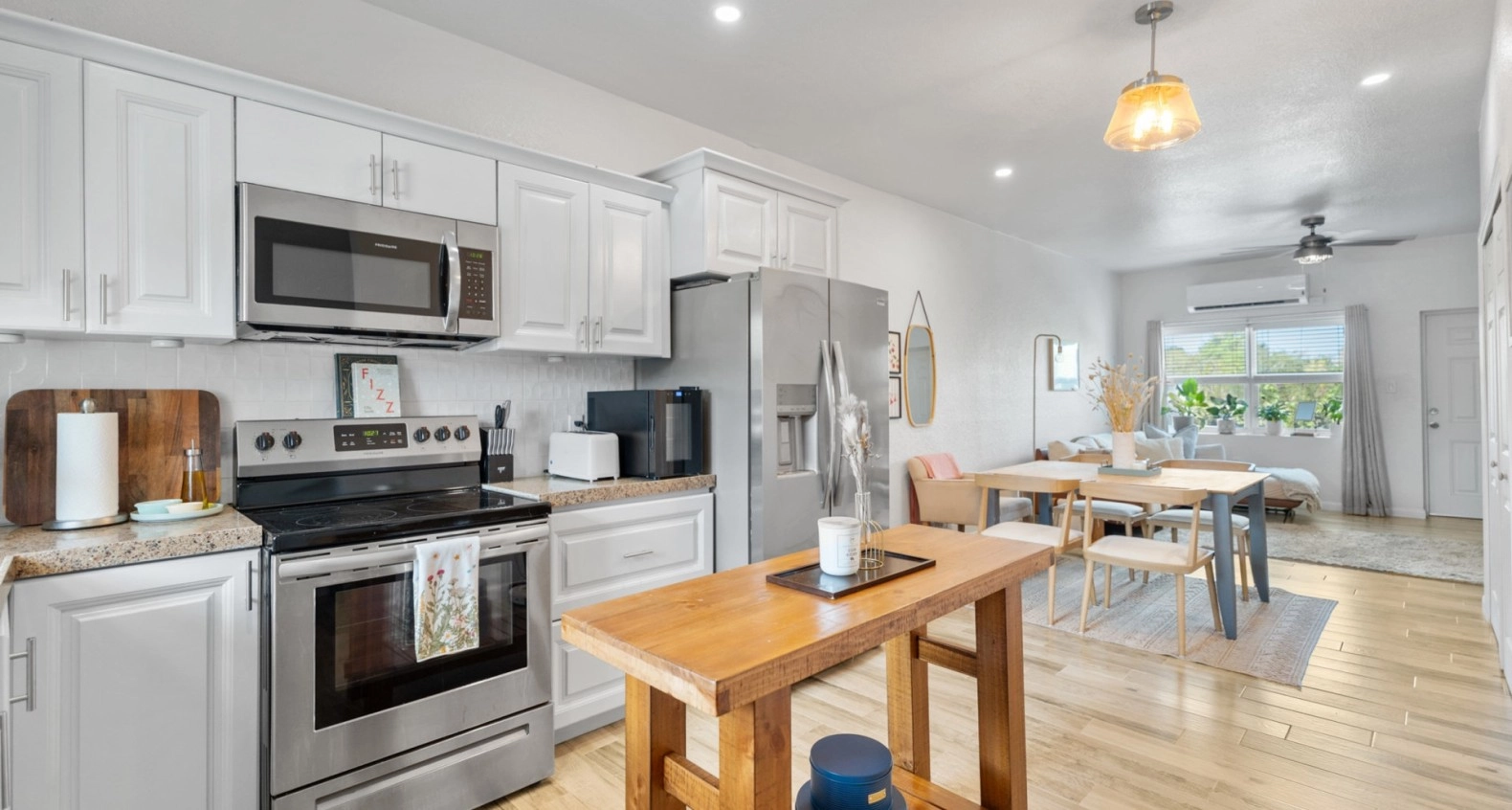 The home features a thoughtfully curated boho-chic design, where soft furnishings and wood accents create a relaxing atmosphere. It includes two bedrooms, with the primary bedroom offering an en-suite bathroom. The ground floor opens to a functional kitchen with light cabinetry, flowing into a dining and living area framed by a large window. A private patio extends the living space outdoors.