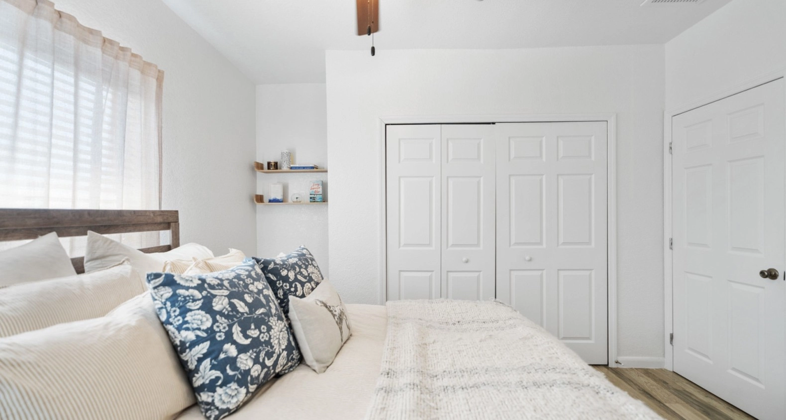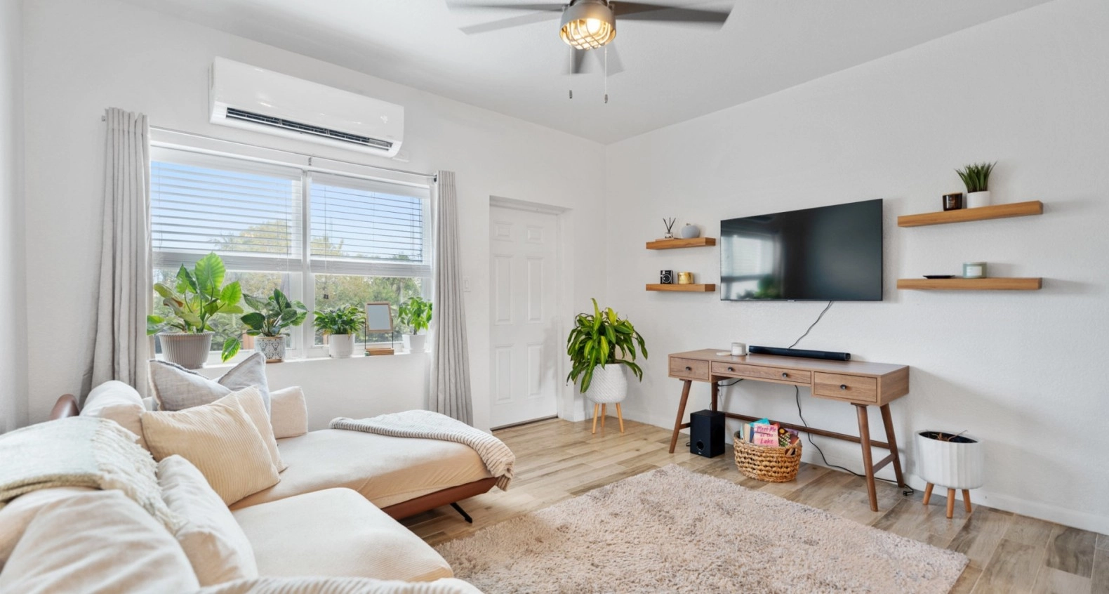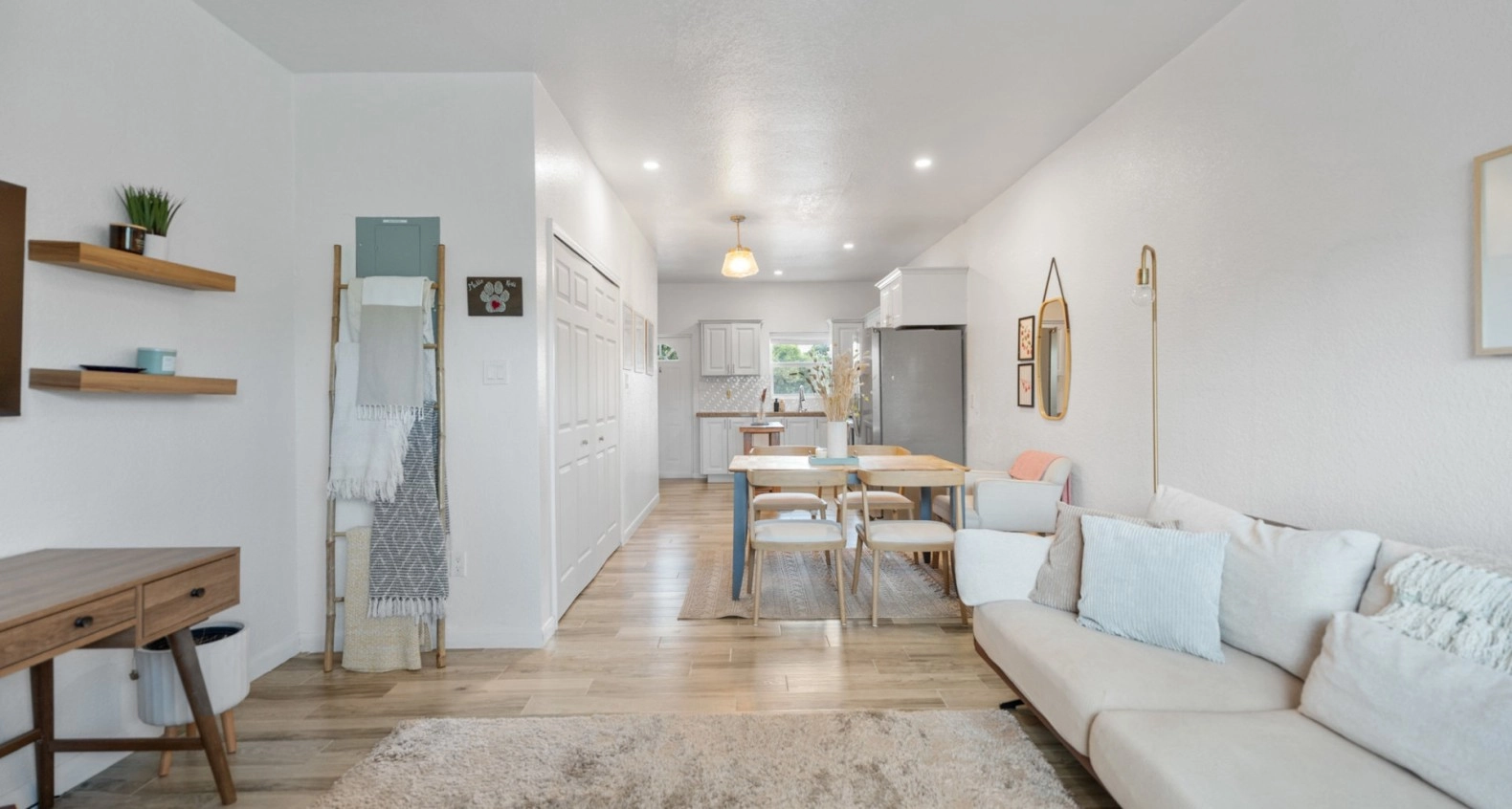 The home features a thoughtfully curated boho-chic design, where soft furnishings and wood accents create a relaxing atmosphere. It includes two bedrooms, with the primary bedroom offering an en-suite bathroom. The ground floor opens to a functional kitchen with light cabinetry, flowing into a dining and living area framed by a large window. A private patio extends the living space outdoors.