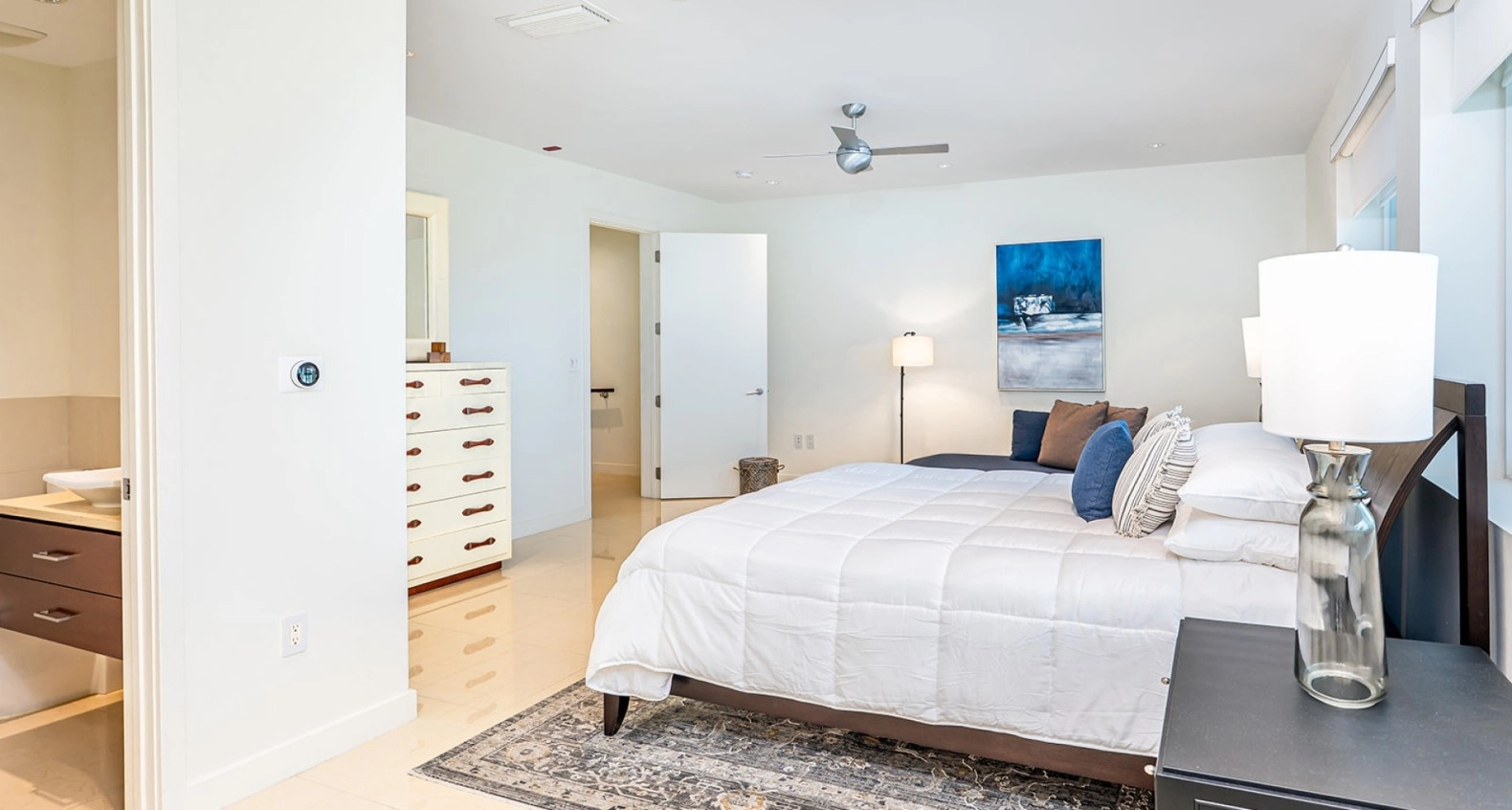 The main level features spacious entertaining areas with wood flooring and a stunning oceanfront balcony off the living room, a perfect setting to enjoy Cayman’s famous sunsets. The master suite, located on the second floor, is nothing short of extraordinary, offering unobstructed panoramic ocean views from both the bedroom and its private balcony. Each bedroom is ensuite, ensuring privacy and comfort for family or guests.