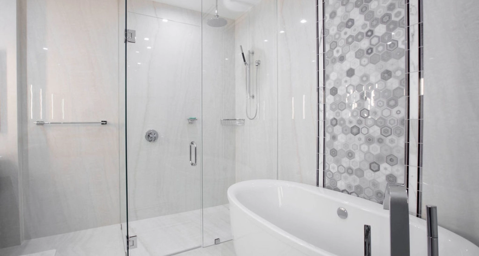 Both bedrooms are very spacious and the king-sized beds are fitted with crisp, white, comfortable linens. The bathrooms are very luxurious, with the main suite featuring an elegant custom mosaic tile design that creates a stunning, floor-to-ceiling backdrop extending behind the freestanding, soaker tub. A standing shower with clear glass enclosure is on one side and a separate toilet enclosed with privacy glass on the other.