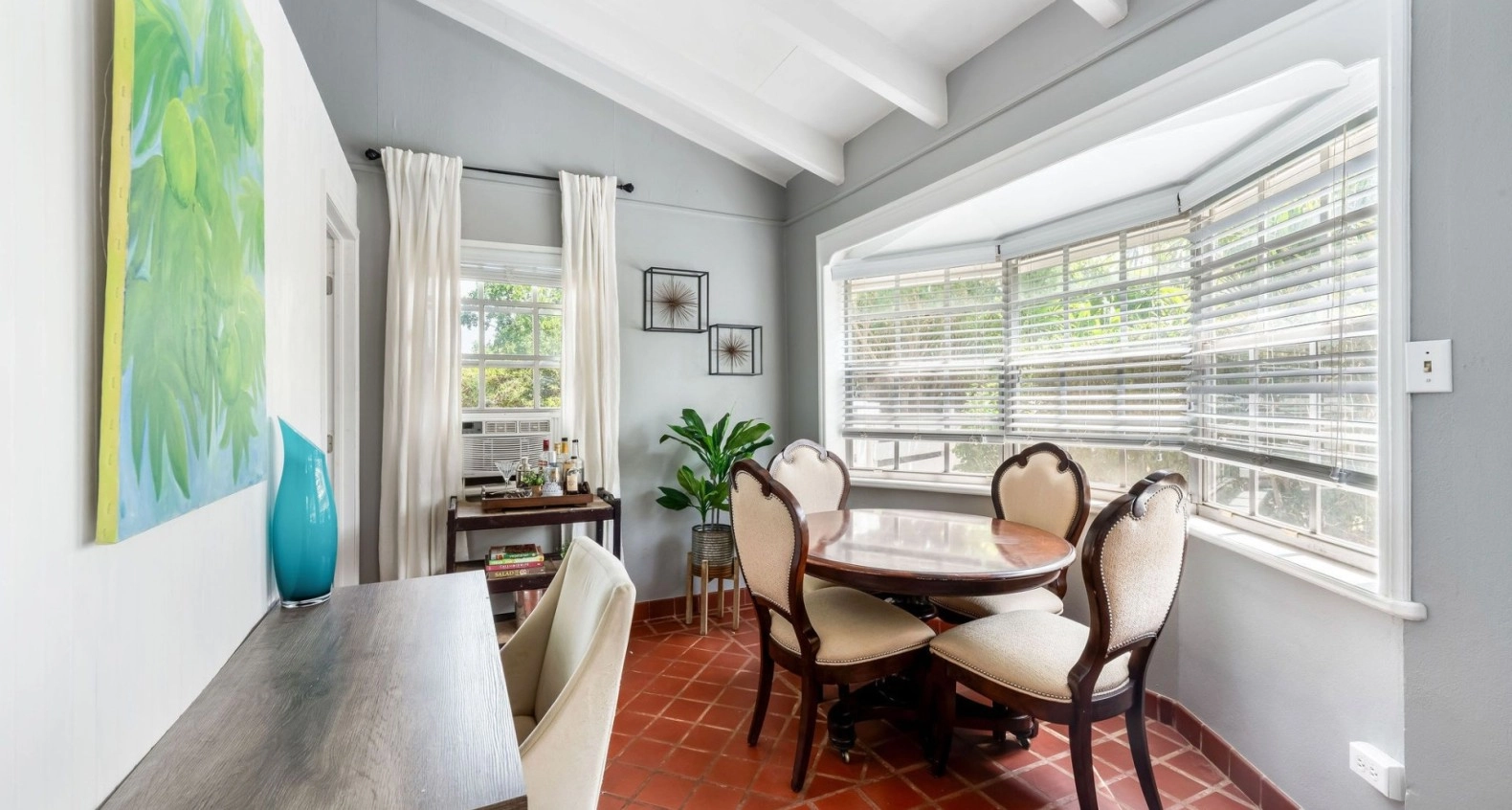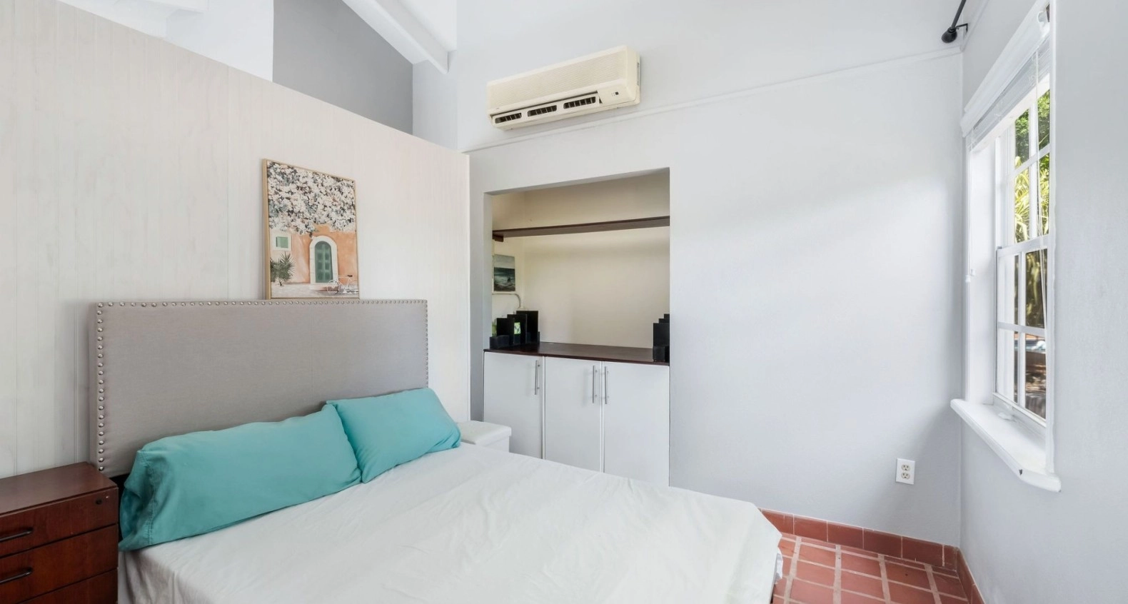 Upstairs is a sun-drenched cottage-style two-bedroom plus one and a half residence. The high ceilings are dreamy, as is the covered porch and open-air stargazing patio. Currently rented long-term. Again, this upstairs cottage-style home can be added to the main house seamlessly and would flow beautifully.