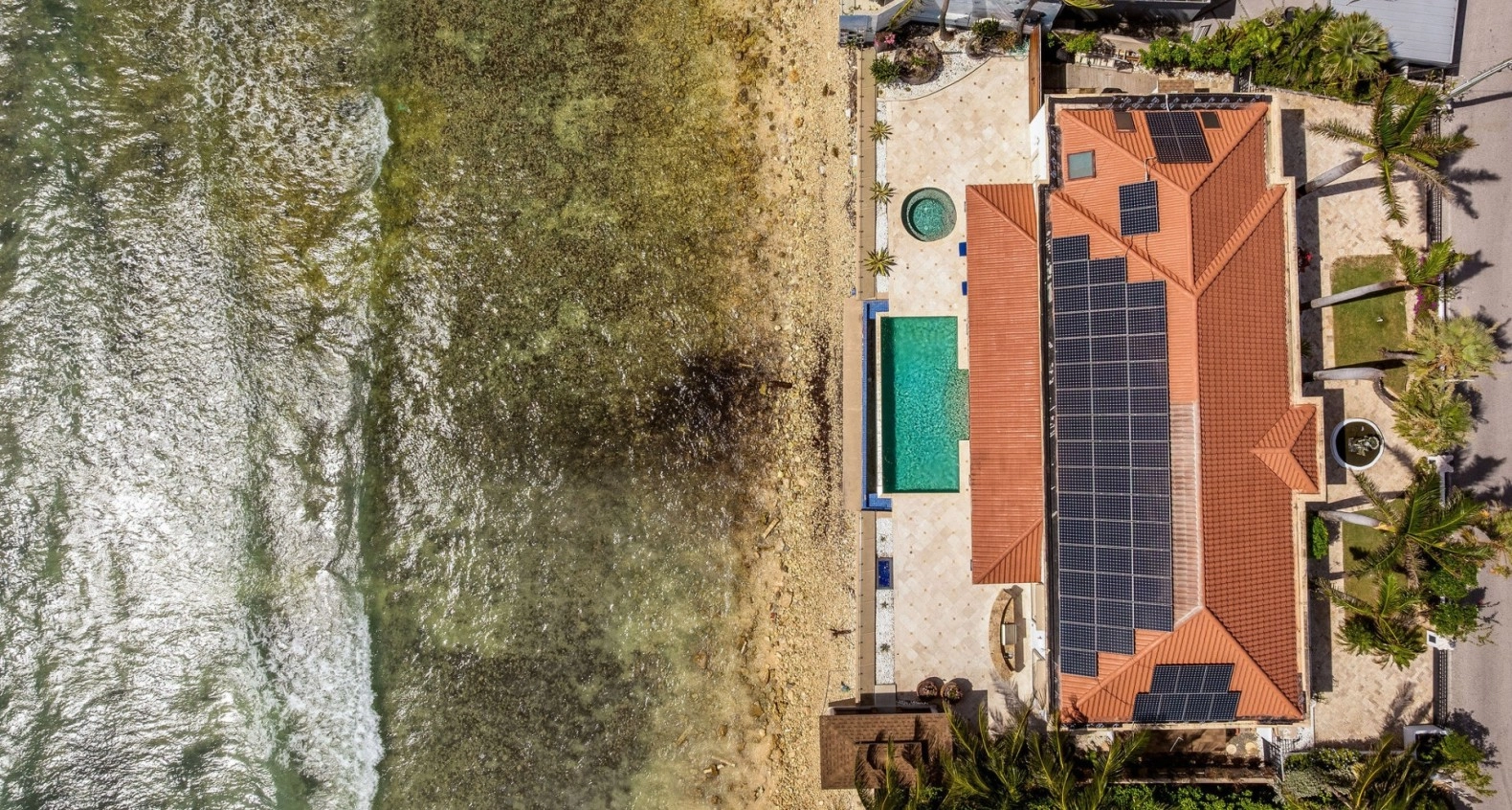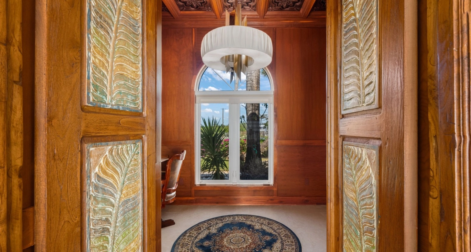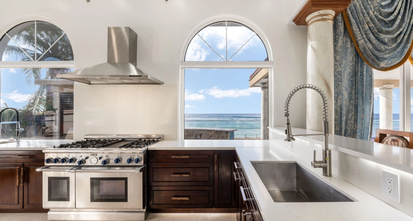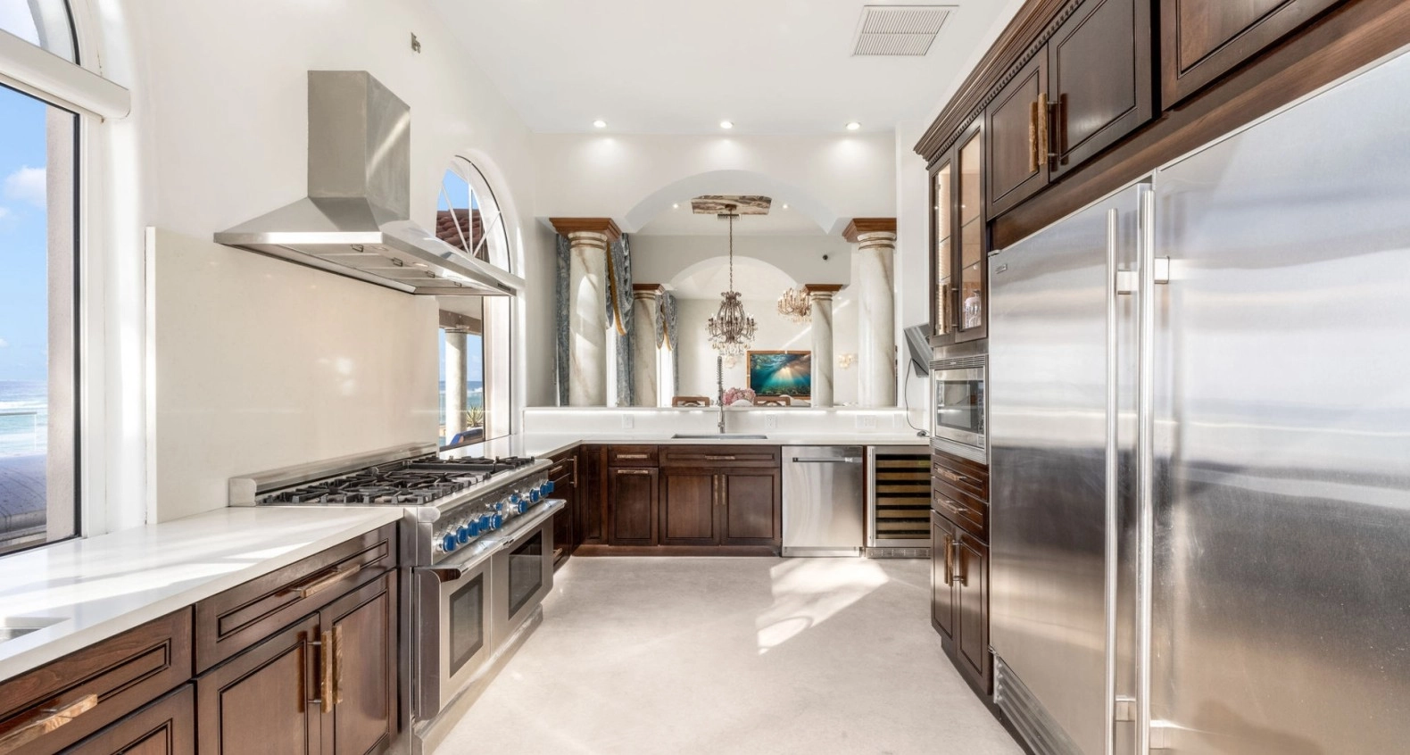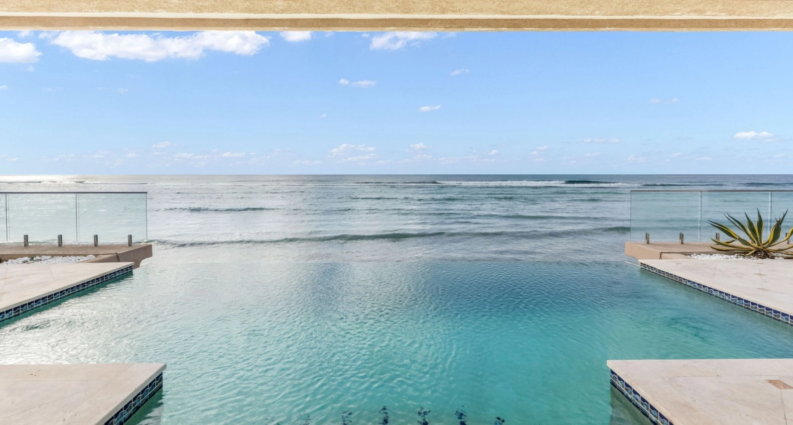Safely perched 15 feet above Sea level and commanding 112 feet of pristine Sea frontage, this exceptional waterfront estate offers uninterrupted sunrise and sunset views and a rare combination of elegance, privacy, and cutting edge sustainability. Recently refreshed with a modern, neutral exterior, the residence features 5 bedrooms and 5 full bathrooms, including a private inlaw/service suite, all framed by soaring 12–18 ft vaulted ceilings, travertine marble floors, and exquisite custom walnut woodwork throughout.