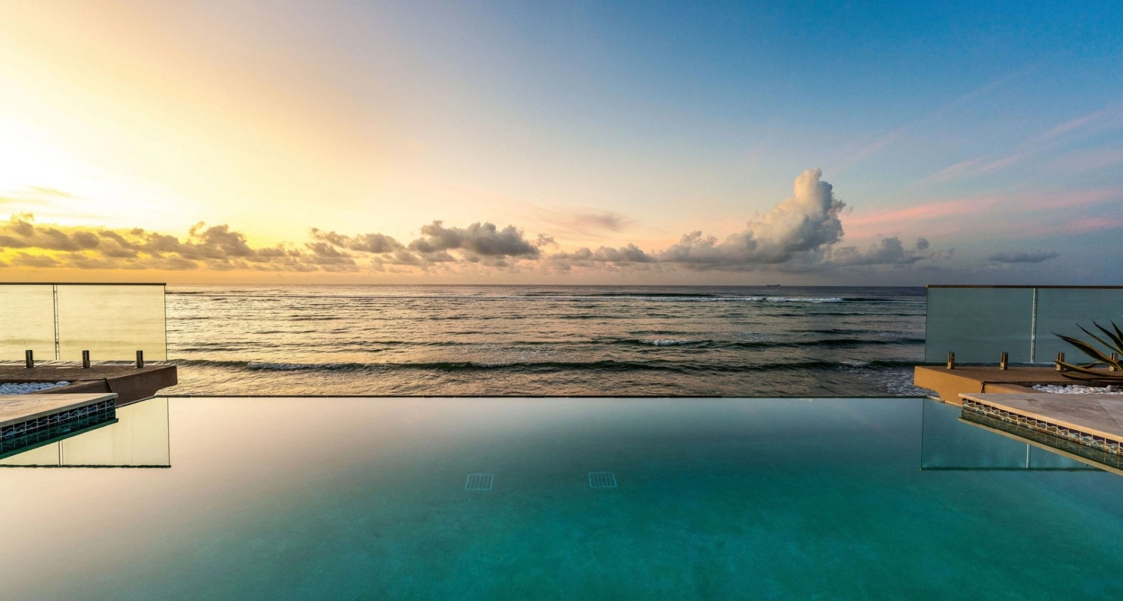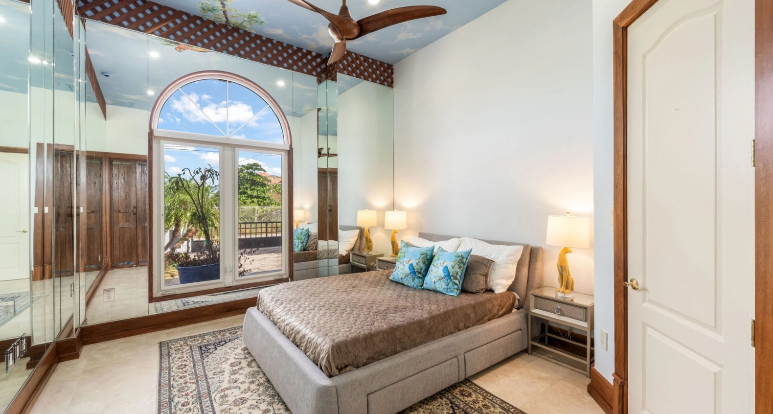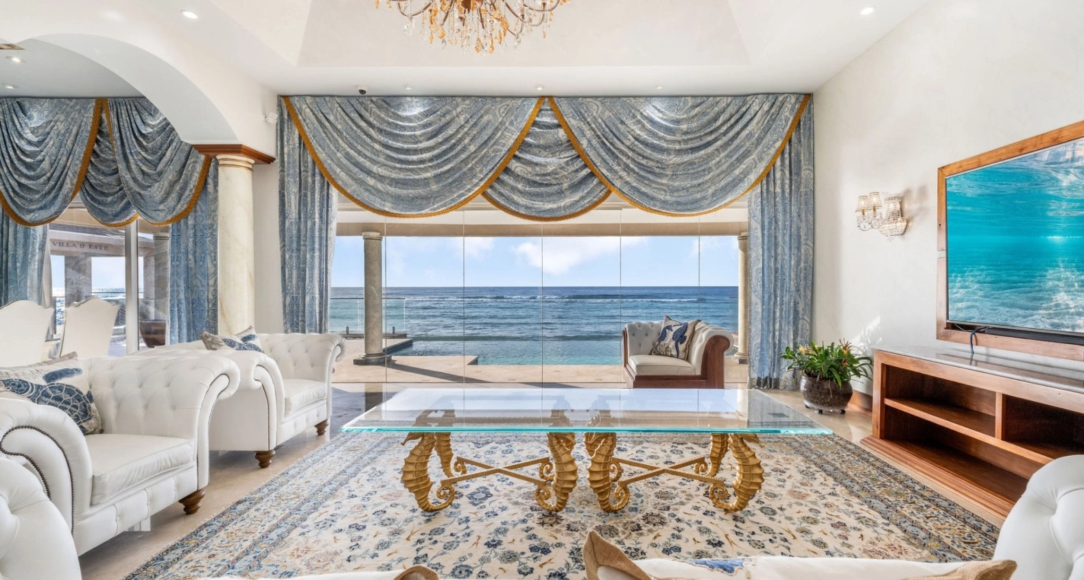 At the heart of the home, the dramatic great room boasts a breathtaking 22 foot wall of hurricane rated glass, delivering panoramic Caribbean Sea vistas that evoke the feeling of living aboard a luxury yacht. Designer finishes include Murano and Swarovski chandeliers, silk Fortuny curtains, Persian rugs, curated decorative mirrors, and bespoke walnut media walls.