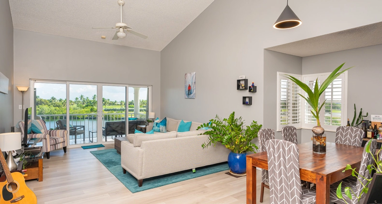 With far reaching views across Mitchells Creek, and the islands golf courses, this fabulous corner penthouse has it all. Extending to a spacious 1509 square feet and comprising 2 bedrooms and 2 bathrooms, with voluminous vaulted ceilings throughout, this fully remodeled unit is ready to go for full time residents, snowbirds, and investors alike. Located within walking distance of the white sands and crystal blue waters of Seven Mile Beach, and within easy access to the islands finest dining and shopping, Camama Bay and schooling, this central location offers everything one could want or need! The tropical grounds, wonderful swimming pool and deck, tennis court, and plentiful boat docking complete the onsite amenities in this well run and maintained complex.