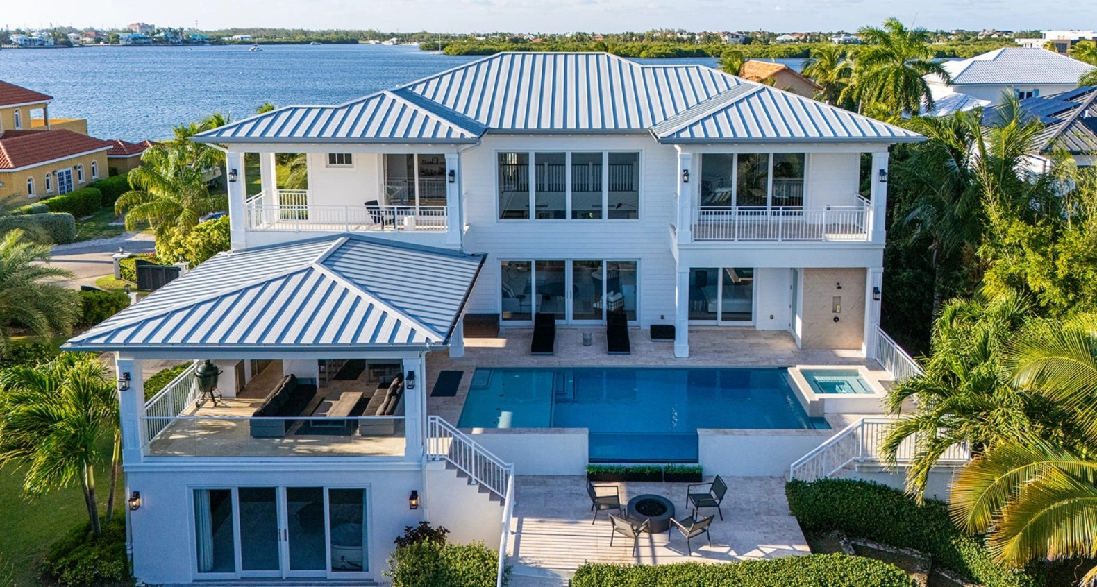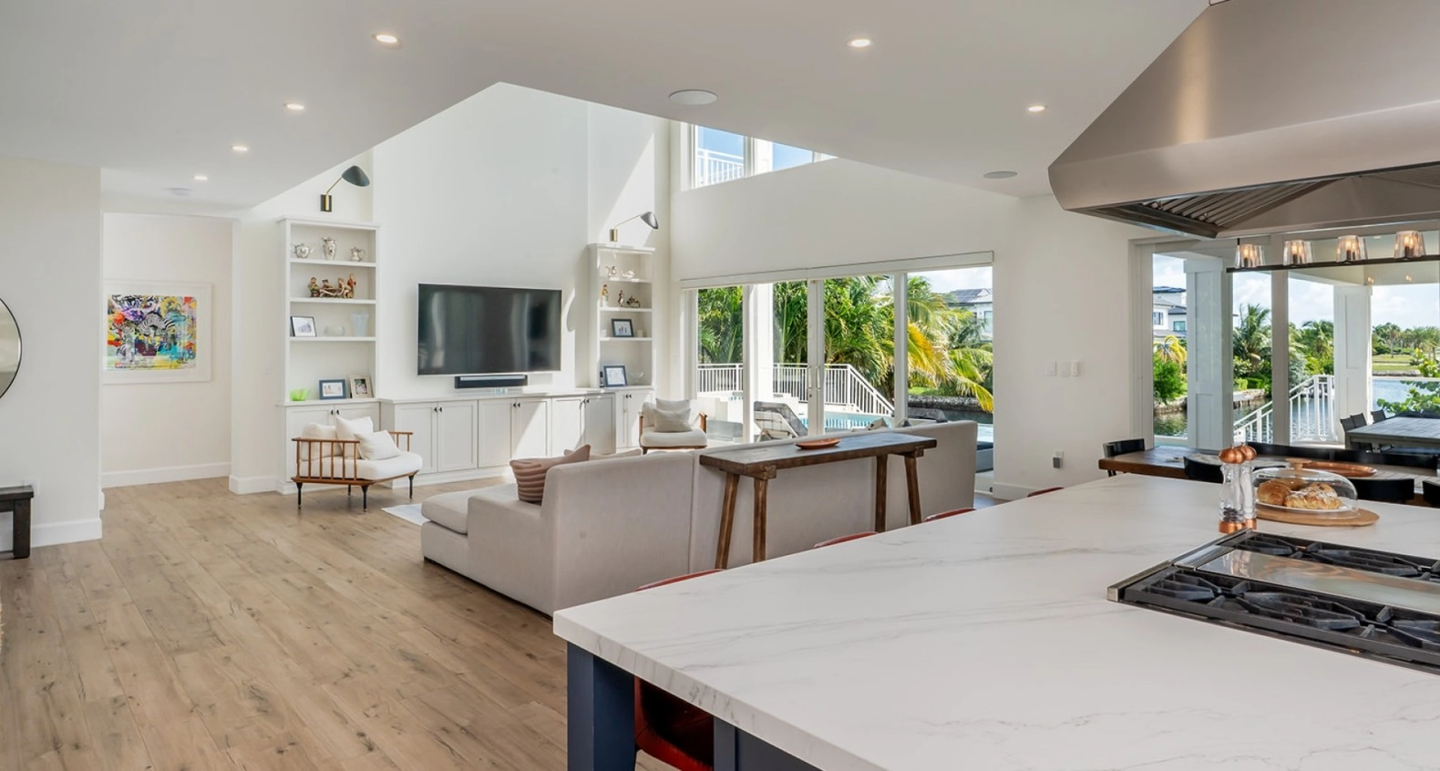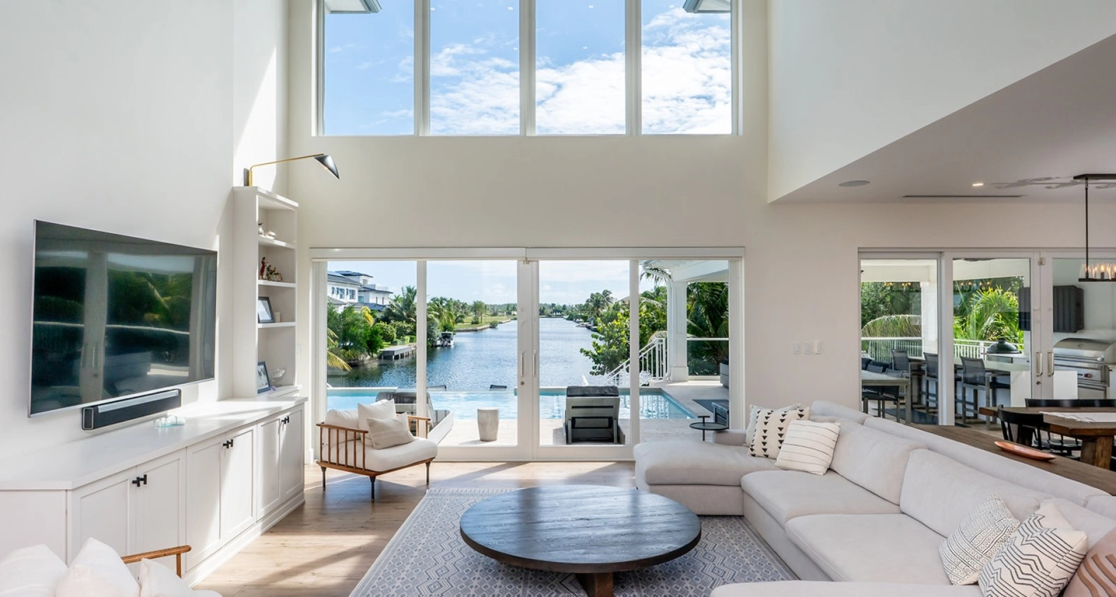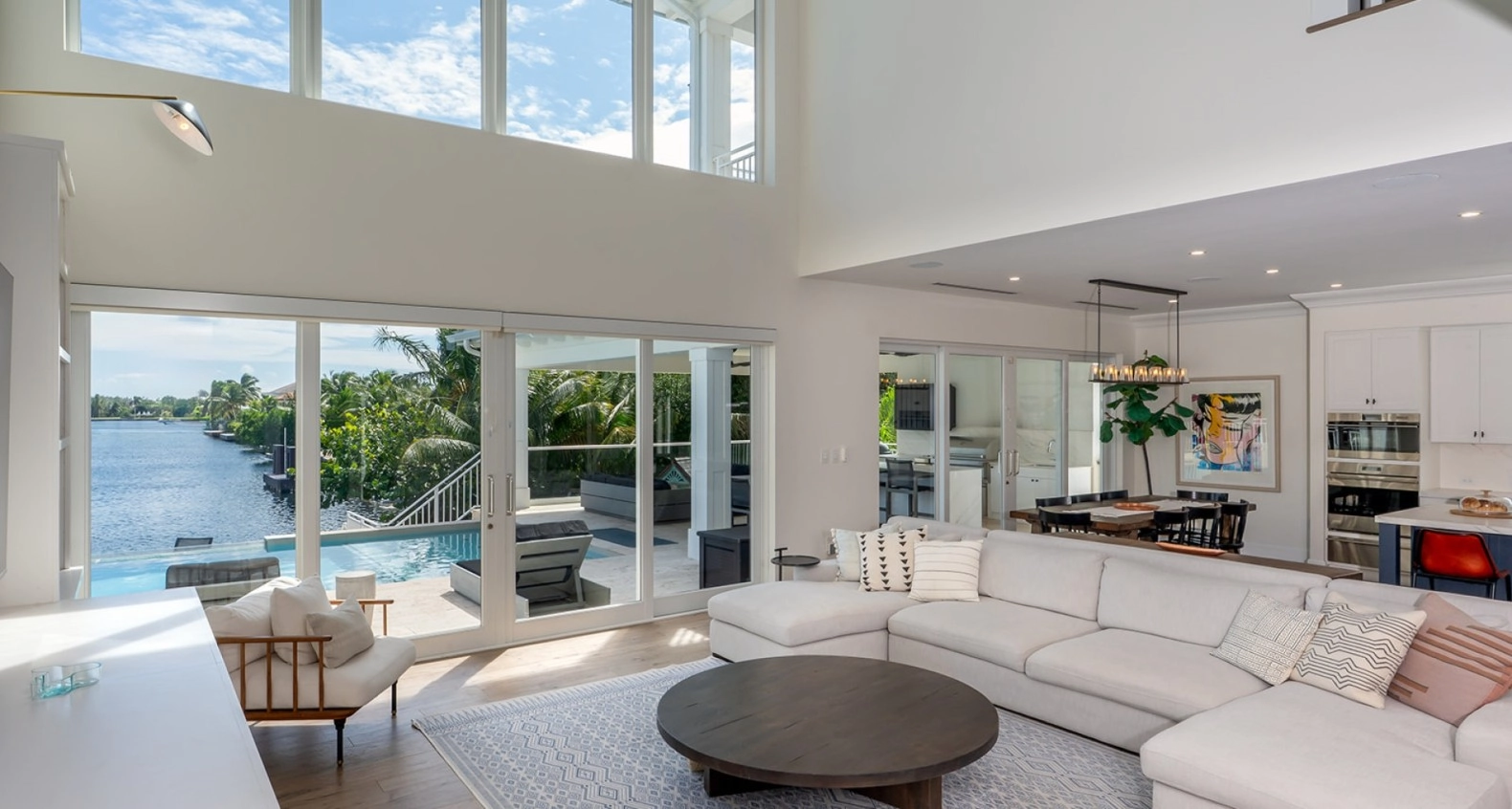 The gourmet kitchen is a chef's dream, equipped with top-of-the-line appliances, sleek cabinetry, and a spacious island for casual dining including a sun kissed breakfast area. Adjacent to the kitchen, the dining area provides a picturesque setting for family meals, with large windows framing the stunning waterfront views. Outdoors, the living space is equally captivating, featuring a beautifully designed infinity pool that appears to merge with the horizon. Relax in luxury on the comfortable lounge chairs surrounding the pool, or gather around the fire pit in the evenings for cozy gatherings under the stars, with a 80ft dock for boats and ski's.