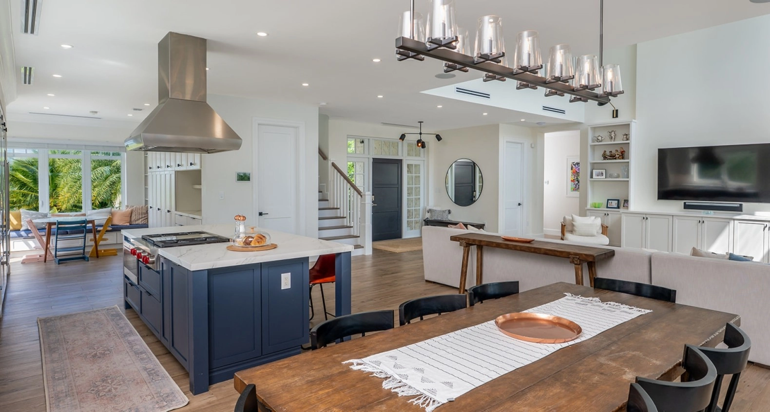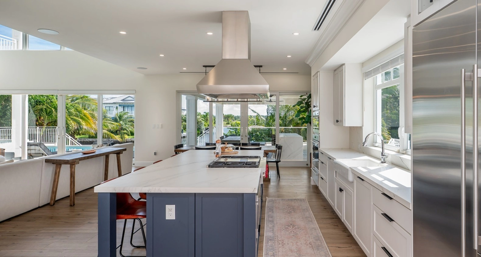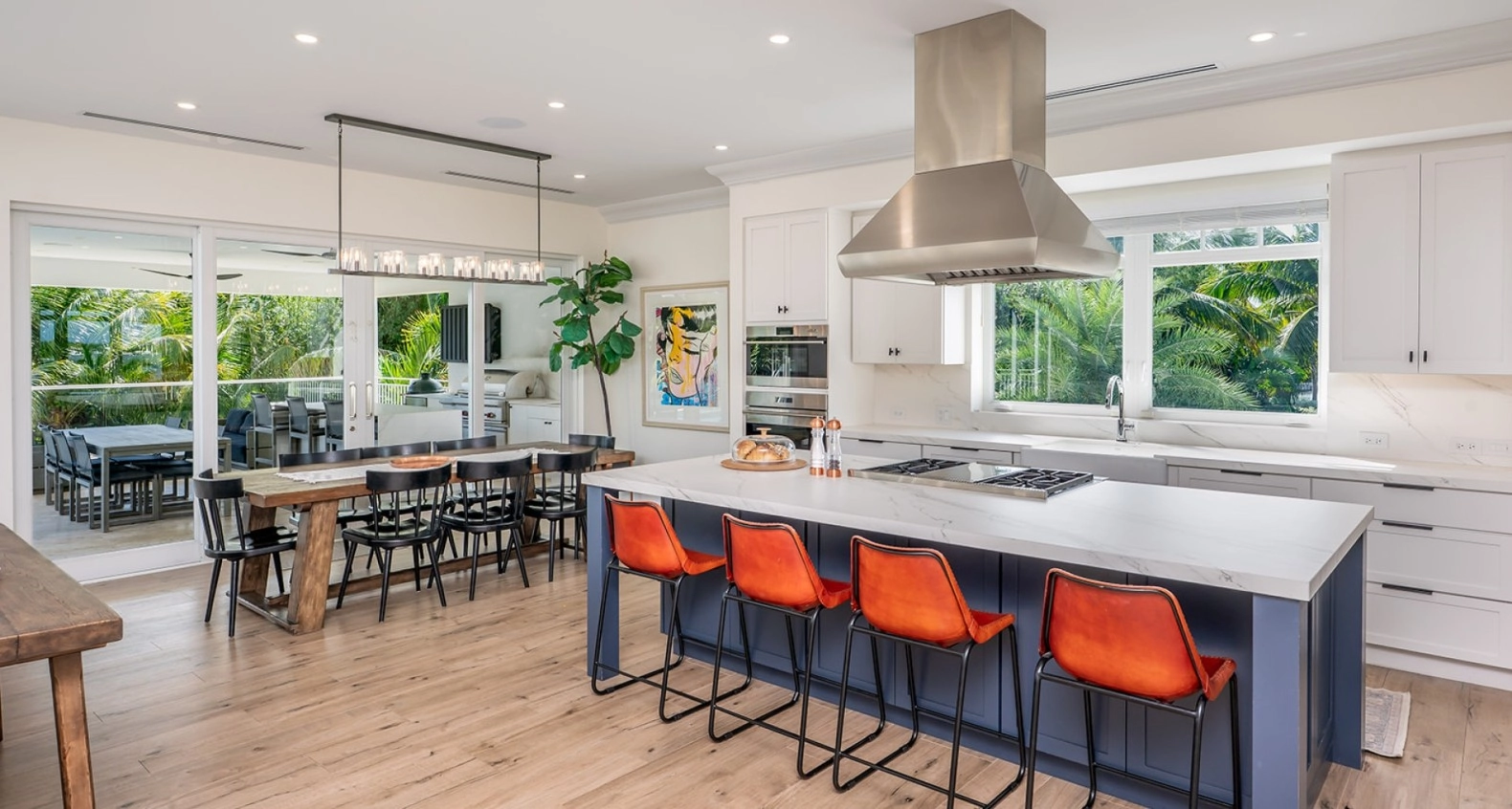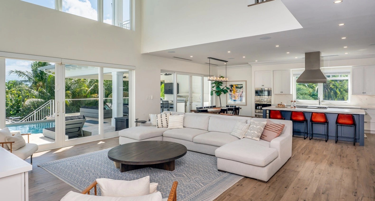 The gourmet kitchen is a chef's dream, equipped with top-of-the-line appliances, sleek cabinetry, and a spacious island for casual dining including a sun kissed breakfast area. Adjacent to the kitchen, the dining area provides a picturesque setting for family meals, with large windows framing the stunning waterfront views. Outdoors, the living space is equally captivating, featuring a beautifully designed infinity pool that appears to merge with the horizon. Relax in luxury on the comfortable lounge chairs surrounding the pool, or gather around the fire pit in the evenings for cozy gatherings under the stars, with a 80ft dock for boats and ski's.