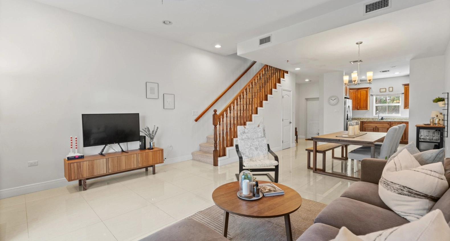 The home is tastefully furnished and features an open-plan layout with a spacious living area, a modern kitchen with stone countertops, and ample storage throughout. Both the master and guest bedrooms upstairs are generously sized, each with en-suite bathrooms.