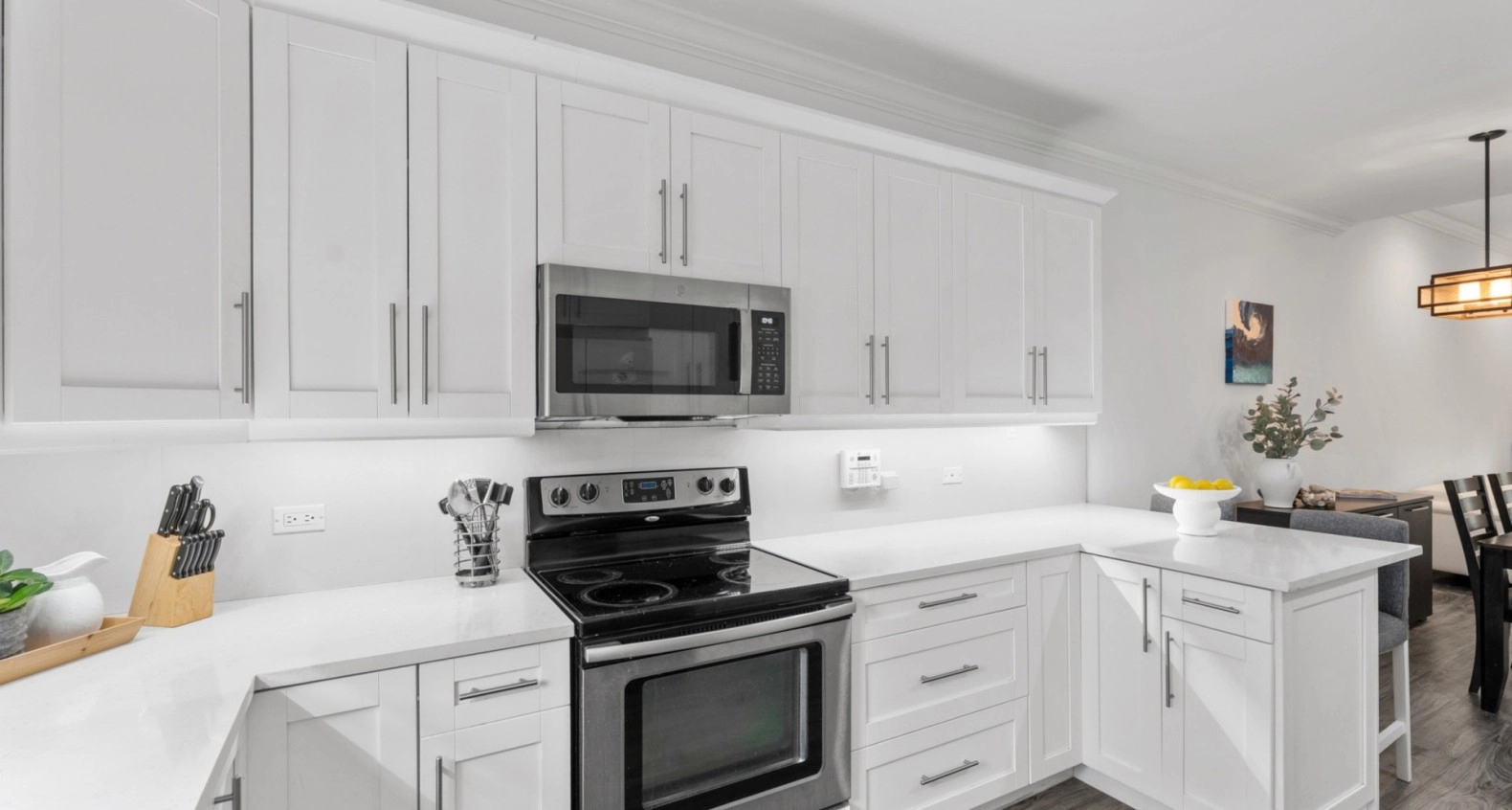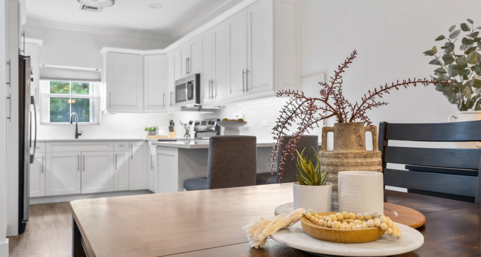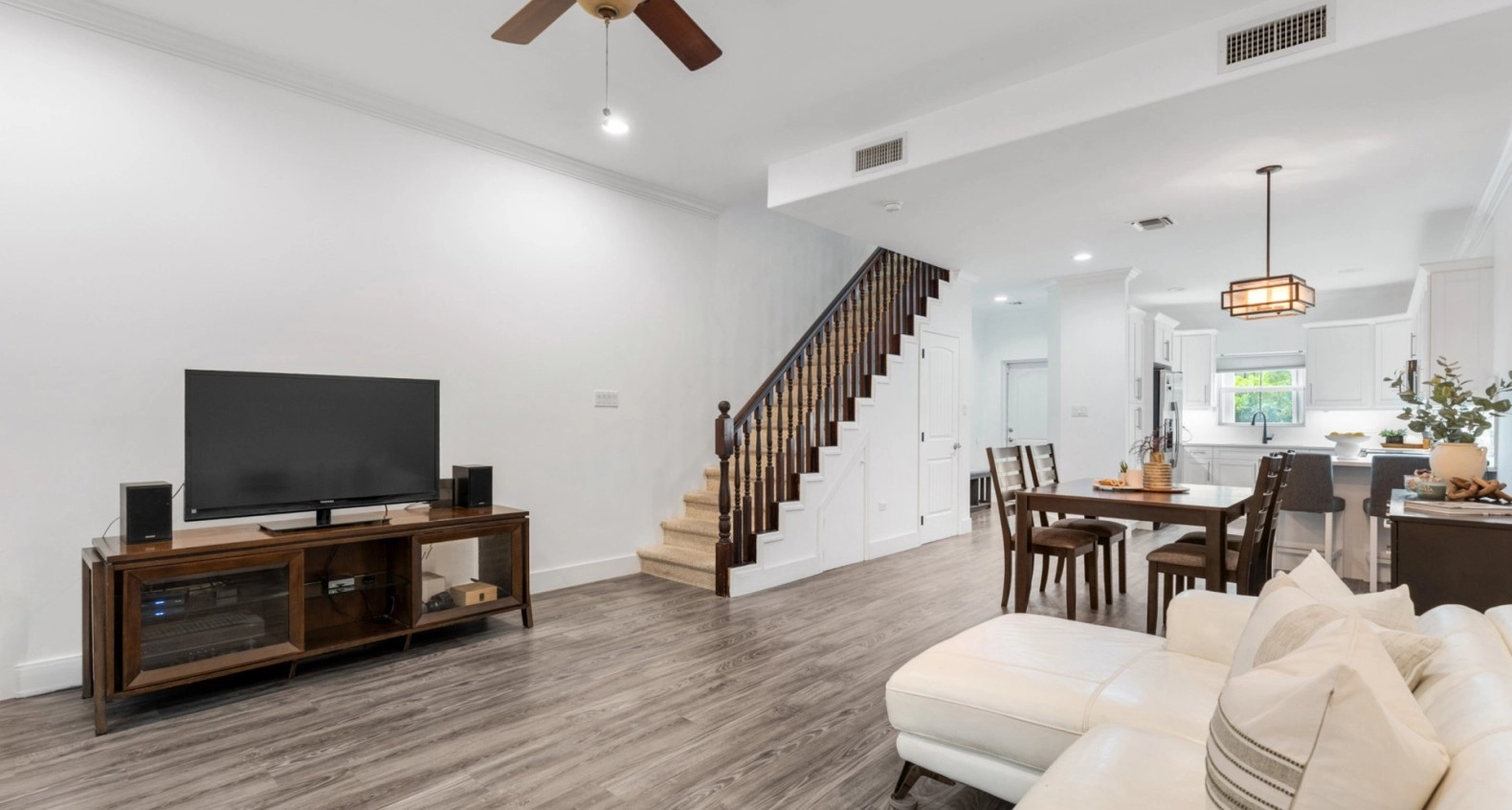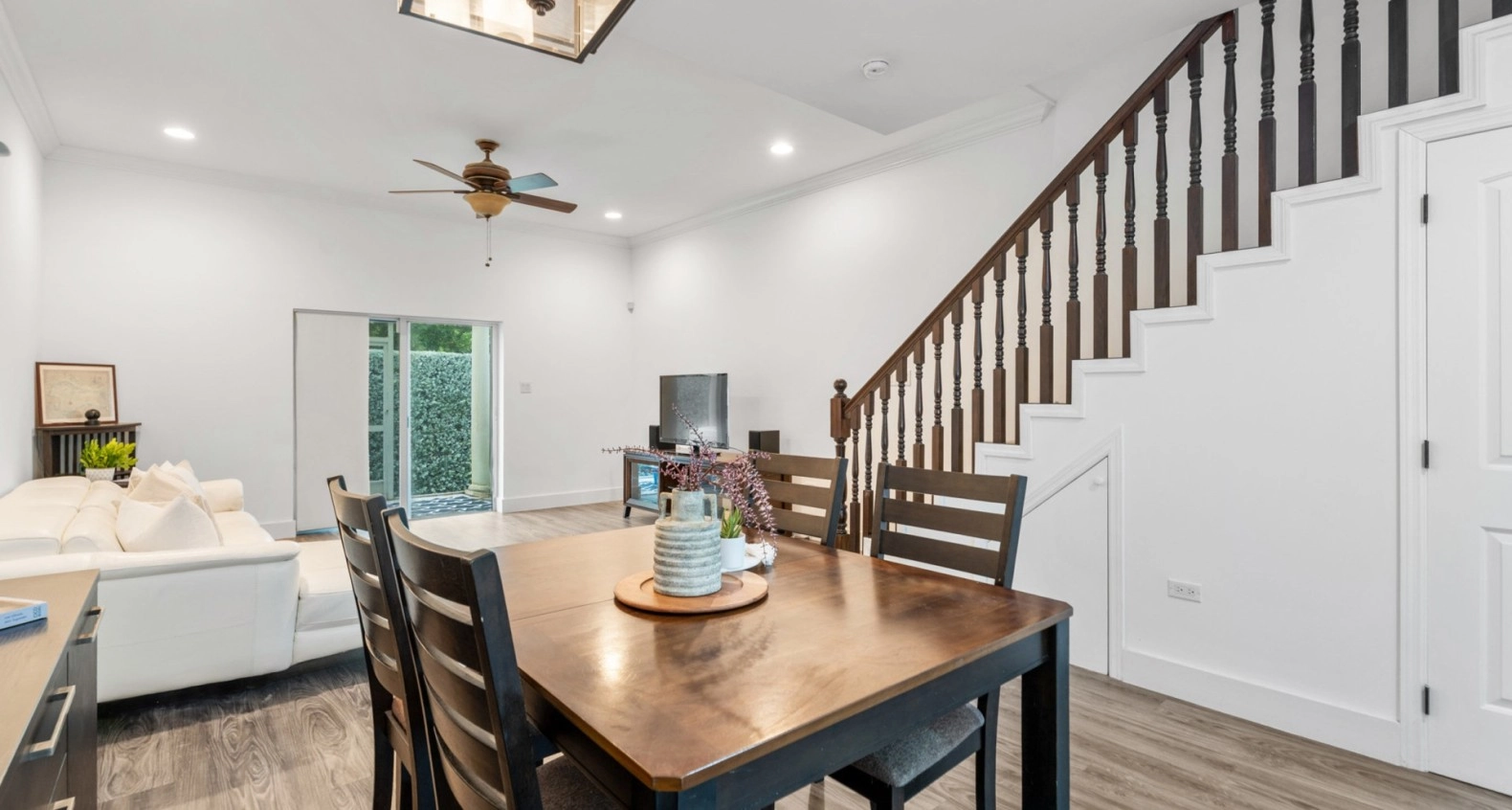 The home is tastefully furnished and features an open‑plan layout with a spacious living area, dining area, and kitchen, all upgraded with new flooring. The kitchen has been fully renovated with stone countertops and generous storage. Upstairs, both the primary and guest bedrooms are well sized, each with its own en‑suite bathroom.