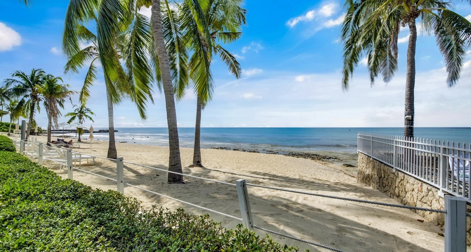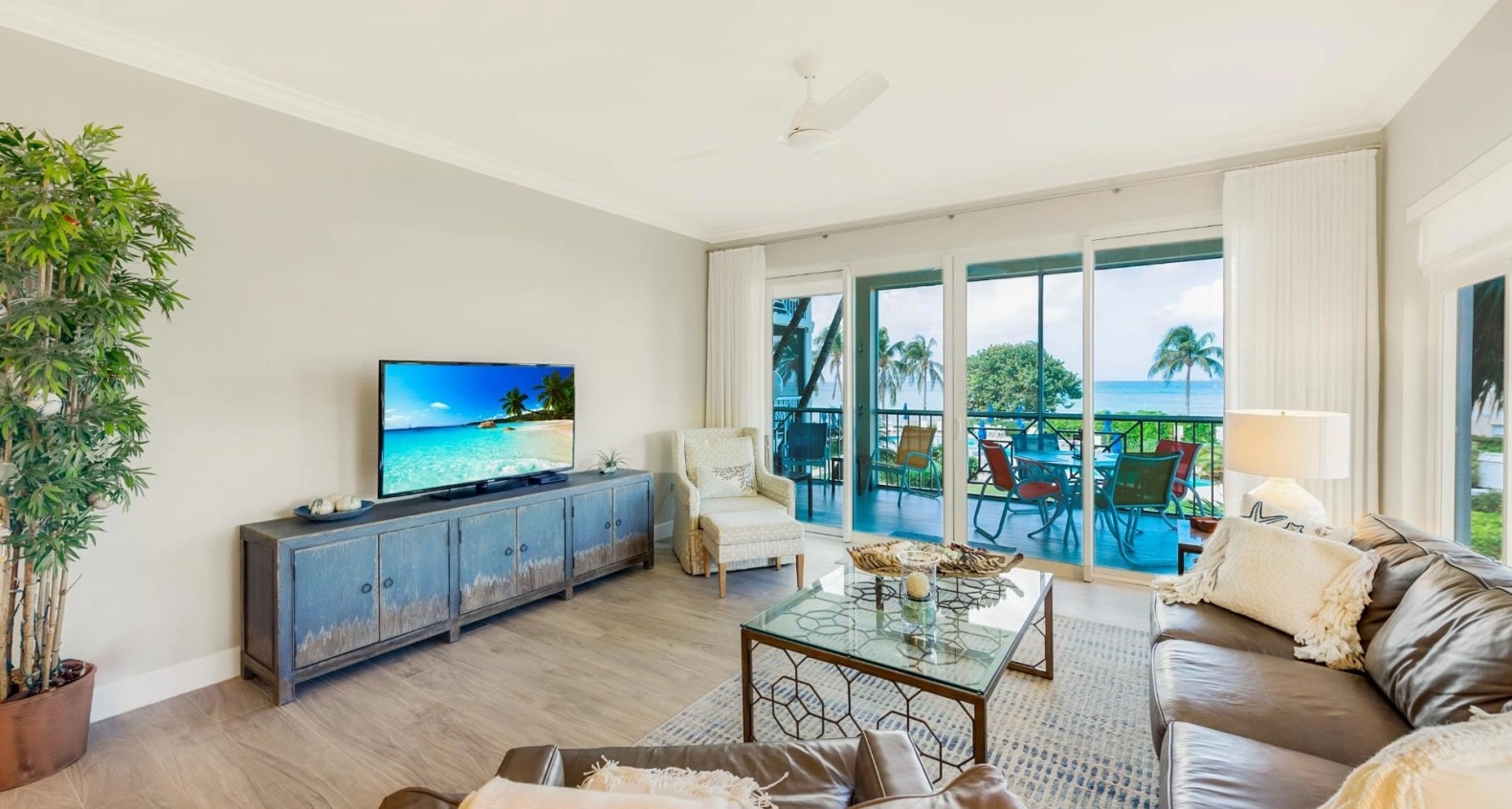 Experience the ultimate waterfront living with this exquisite fully remodeled 3-bed, 2-bath condo at Crescent Point Resort, offering 1,819 square feet of elegantly designed living space. This fully furnished residence combines island charm with breathtaking ocean views and lush resort grounds in the heart of Seven Mile Beach. The condo features a luxurious master suite with a king-sized bed, an en suite bathroom with an oversized soaking tub, a separate shower stall, and a double vanity. Two additional flexible bedrooms can be configured with king, queen, or twin beds to suit your needs. The gourmet chef’s kitchen, equipped with top-of-the-line appliances, opens into the spacious living and dining areas, creating a perfect environment for relaxation and entertainment. Enjoy the serene outdoors from the expansive doublewide, private, screened terrace, overlooking the resort's lush grounds, pool area, and over 200 ft. water frontage.