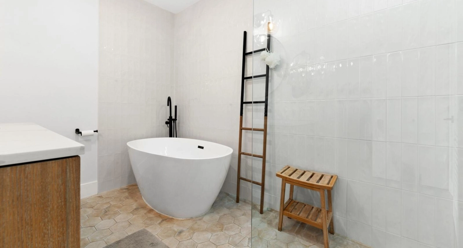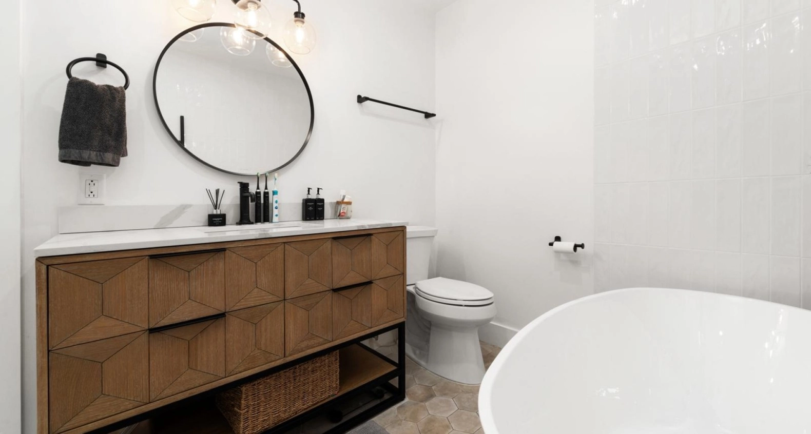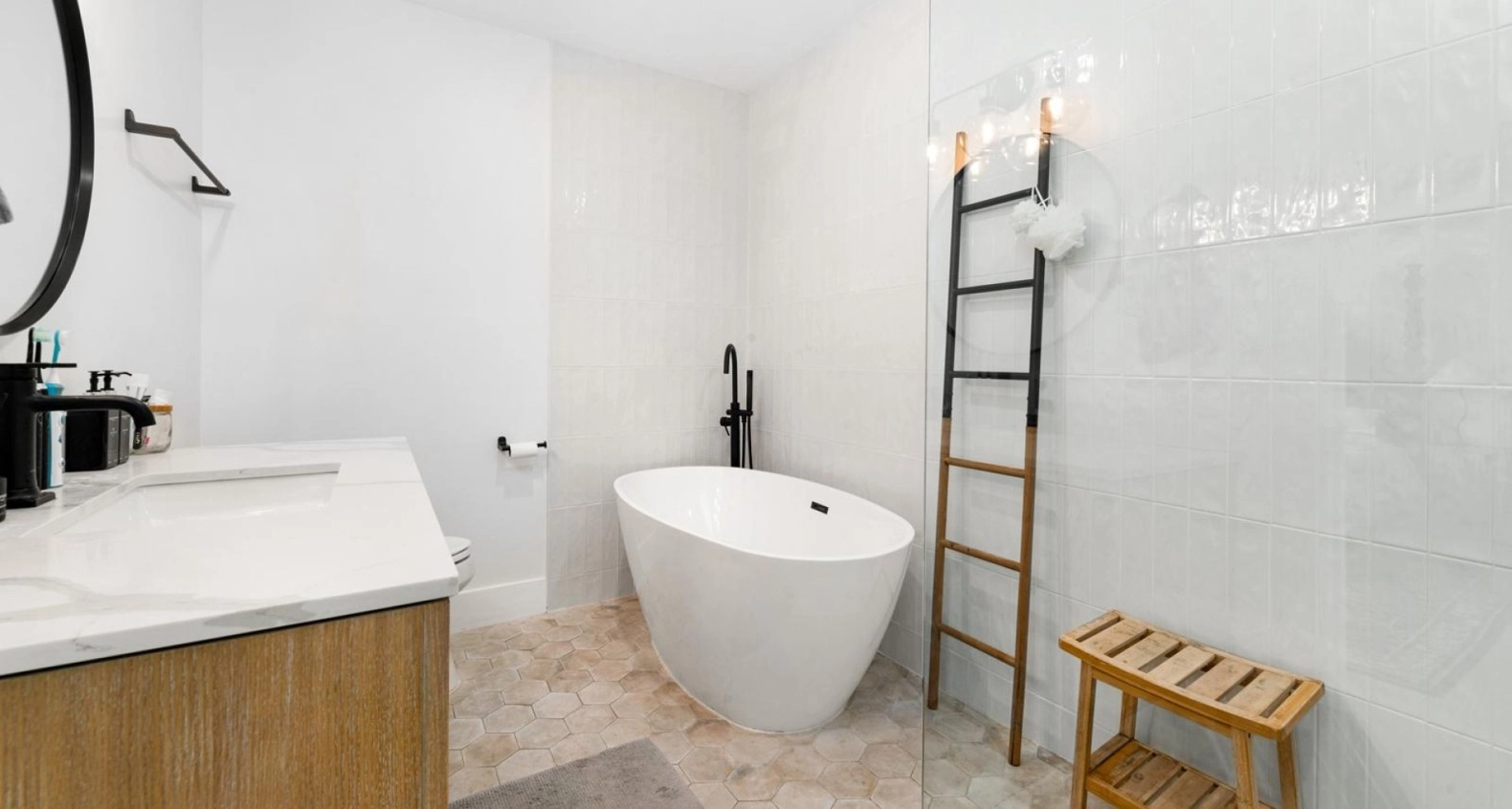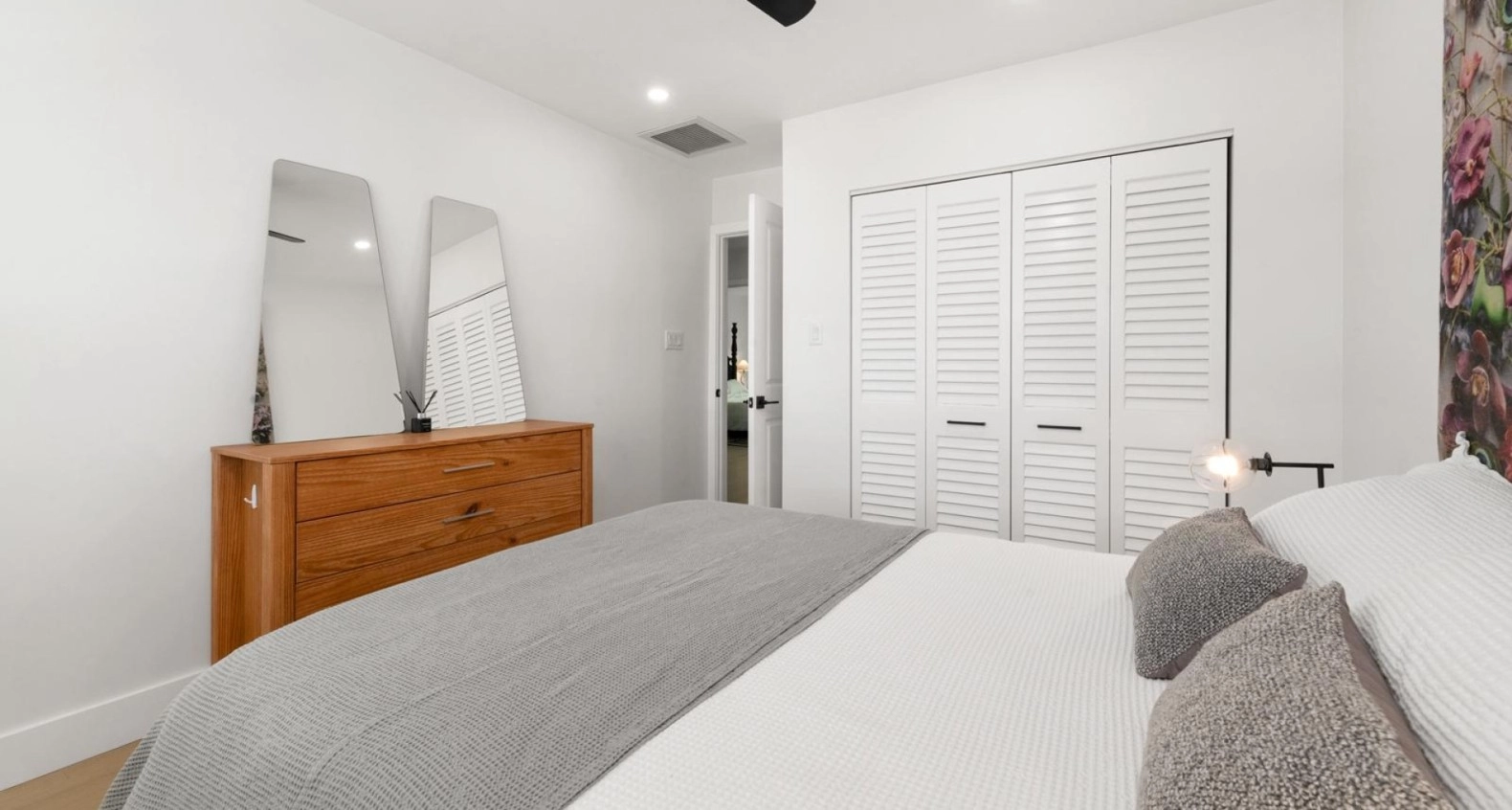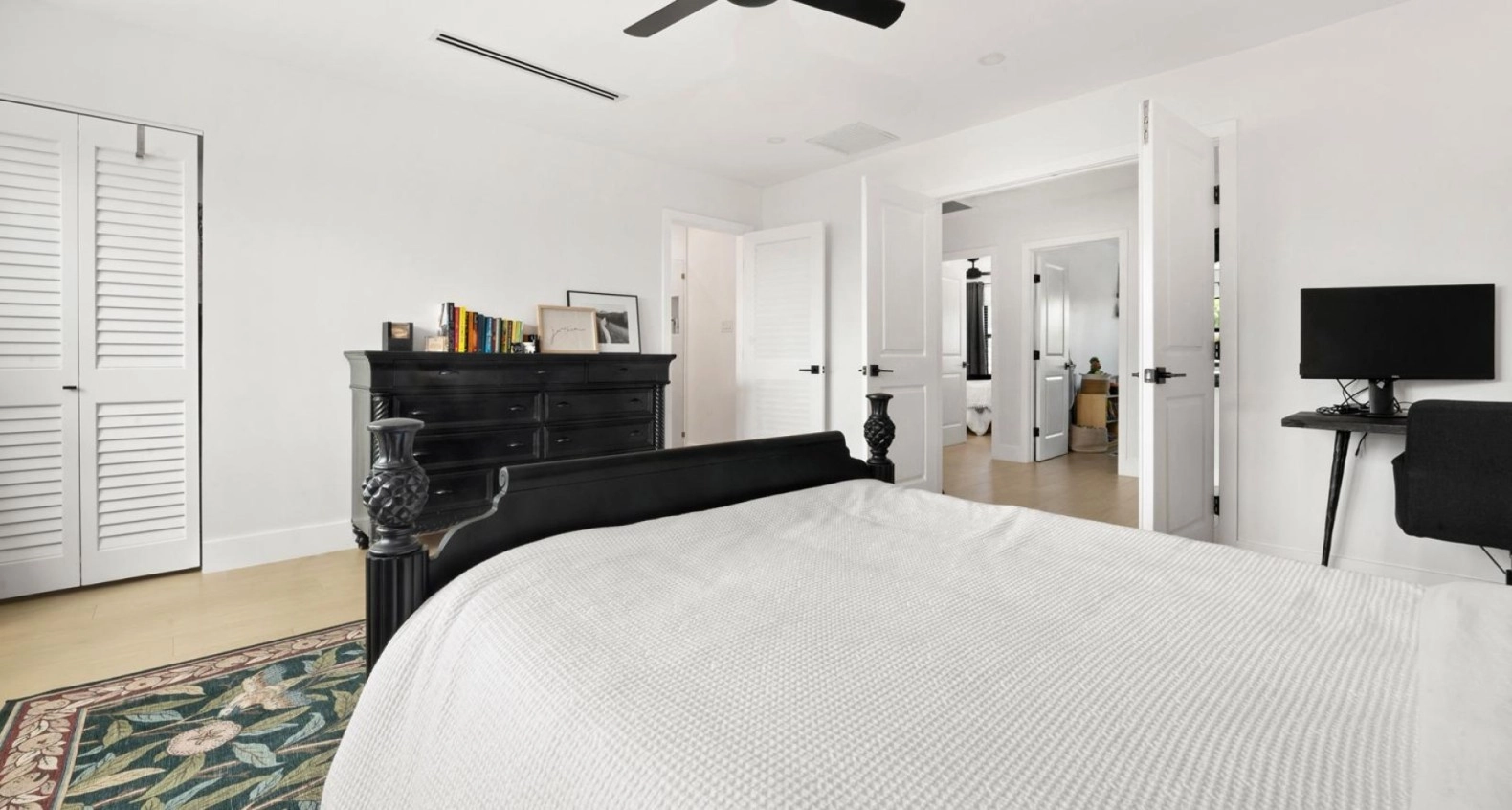 Up the stairs to the second floor, what used to be an oversized landing has been narrowed slightly to give each bedroom some more room to play with. What used to be a small Den on your immediate right has now been converted into a fully functional bedroom with a fitted closet. This new bedroom, adjoining with another bedroom share access to a full bathroom with a brand new vanity and walk in shower. Through a set of french doors you will find the master bedroom which has seen a complete transformation. What was once a wide open standard bedroom remains of generous size, but now includes an extended master en-suite bathroom roughly double the size of its original style counterpart, with a walk in shower, stand-alone tub, and modern finish double vanity.