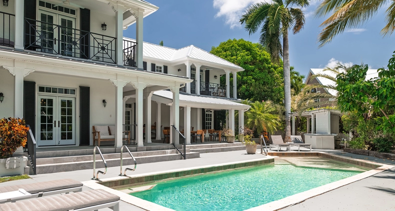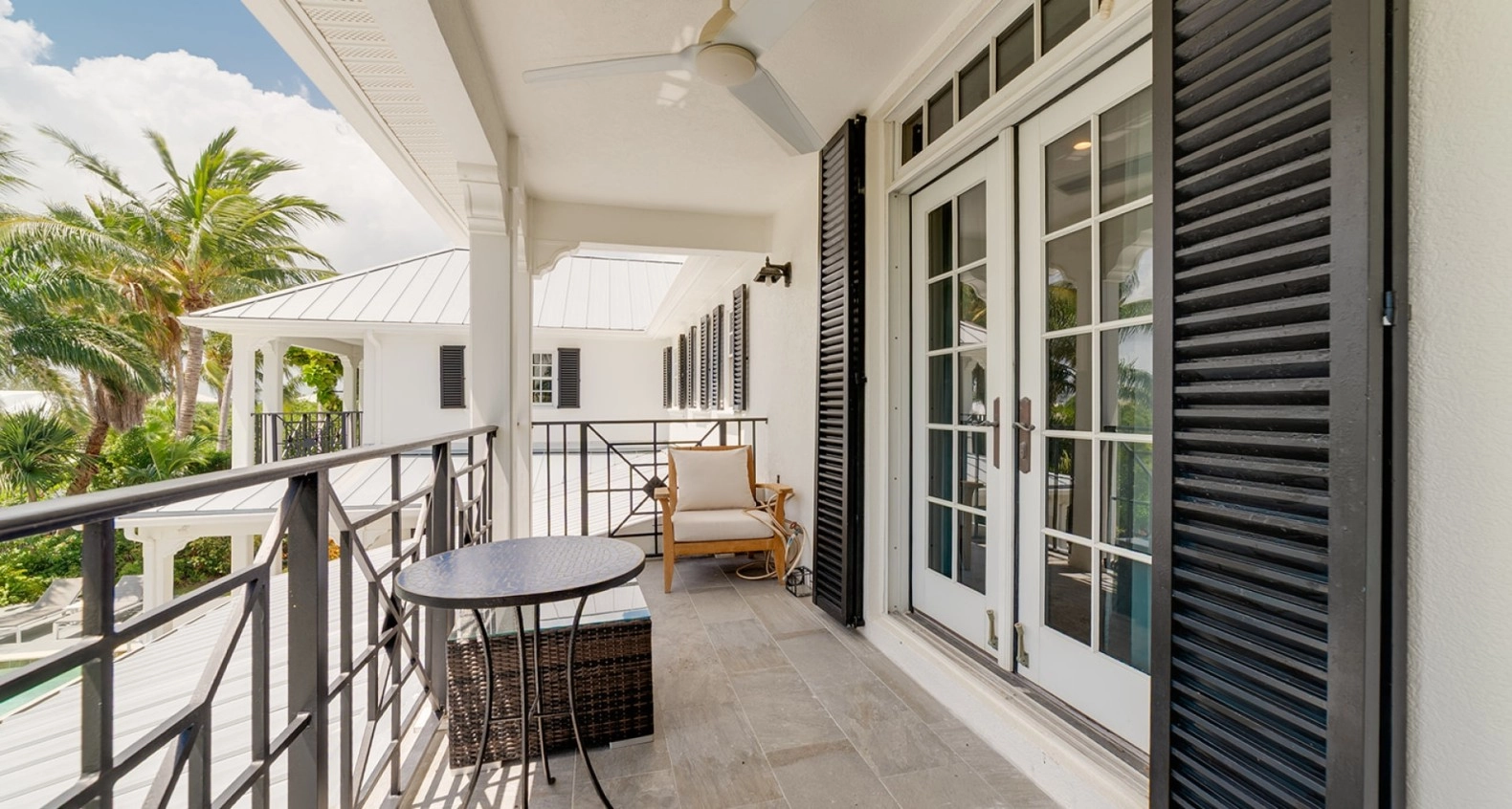 French doors open to a breezy covered patio, ideal for outdoor living and entertaining. Take a dip in the sparkling pool or fire up the grill in the custom-built BBQ area, all surrounded by new lush landscaping and fruitful tropical trees. And now, with a brand-new dock just steps away, your boat days are easier than ever. The elegant sweeping staircase leads one upstairs with soft natural light which adds a graceful Caribbean feel throughout. Here you will find three spacious bedrooms — all with water views. The primary suite boasts vaulted ceilings, a large walk-in, professionally-fitted closet, and a tranquil ensuite bath. French doors open to a sizable, East-facing balcony overlooking the canal, perfect for morning coffee or a quiet read as the sun comes up. There is a further East-facing balcony off the second suite too.