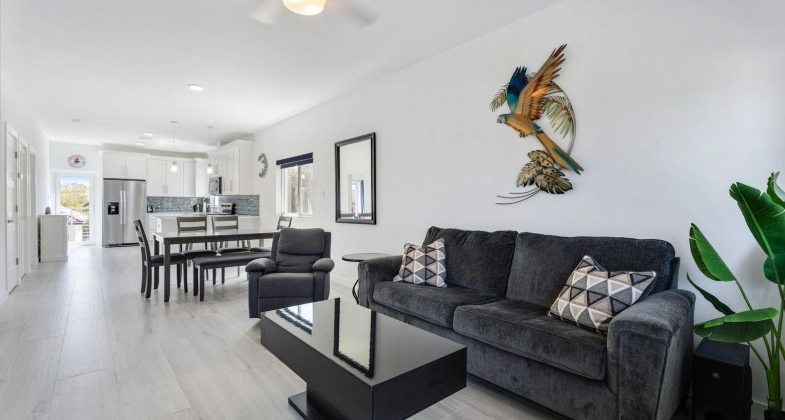 Step inside to an open layout enhanced by contemporary finishes, dimmable lighting, and energy-efficient stainless steel appliances. The home is fully equipped for modern living, featuring a Yamaha MusicCast sound system, three large TVs, cordless blinds throughout, as well as a sofa bed and trundle bed for added flexibility.
