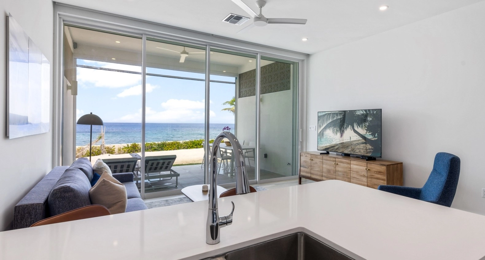 This 1-bed/ 1.5-bath seafront, ground floor condo is the best-priced direct-waterfront unit in the development at CI$660,000. Encompassing 869 square feet, this residence offers captivating sea views from its airy patio. Thoughtful upgrades, including premium tiles and high-end appliances with a beautiful furniture package included, elevate this unit’s appeal. Designed with a wide frontage, the space is bathed in natural light, with floor-to-ceiling glass sliding doors seamlessly connecting indoor and outdoor living—perfect for enjoying sunsets and ocean breezes.