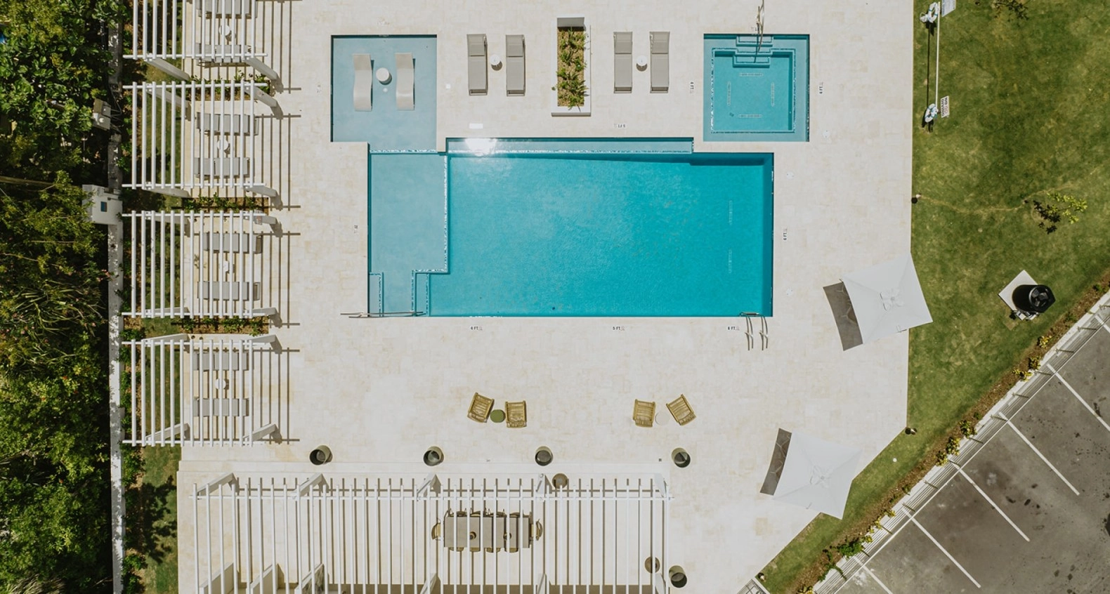 - Sparkling pool with a sundeck and trellised sunbathing areas.
