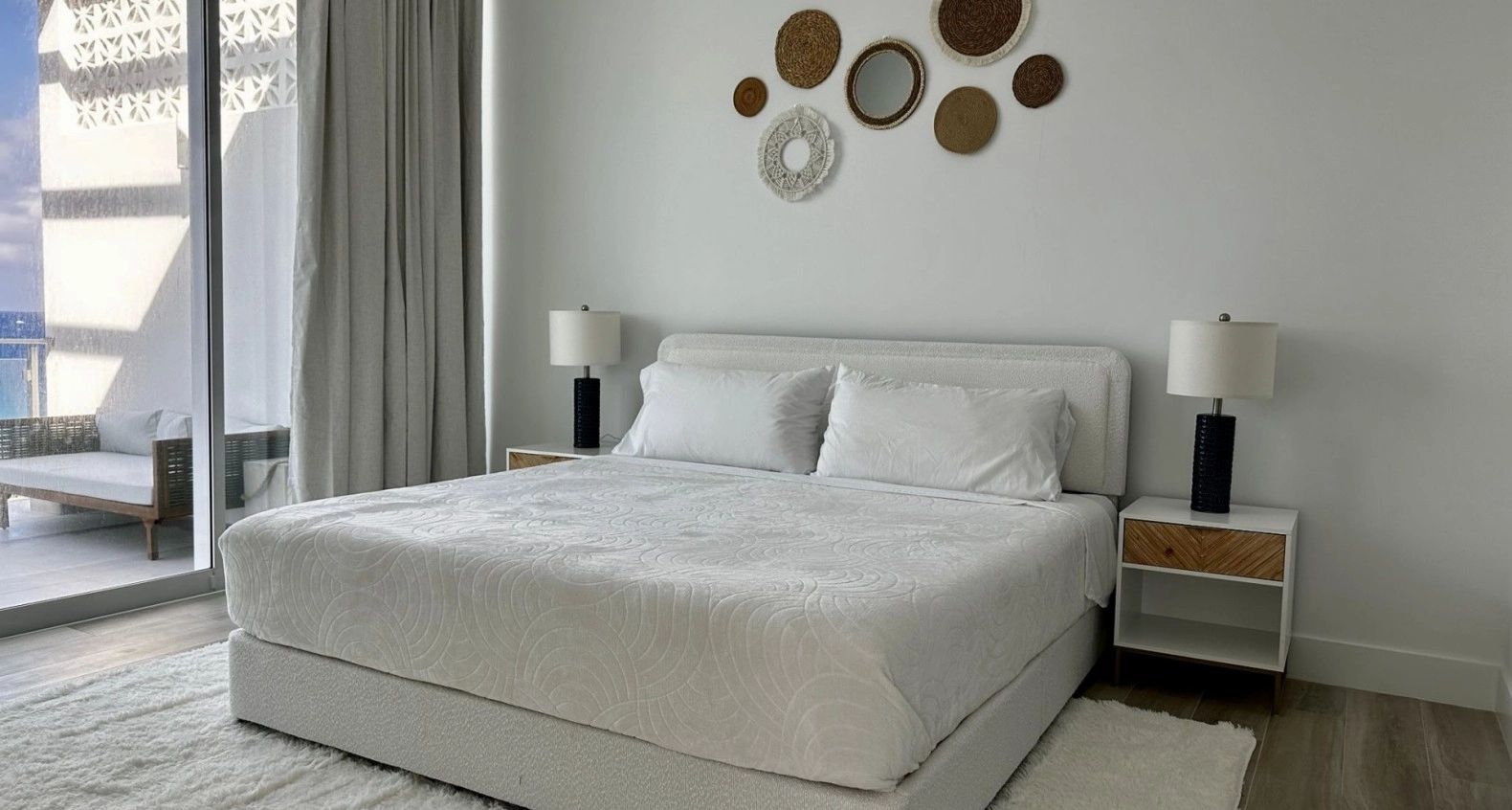 Boasting floor to ceiling glass doors, high ceilings, a massive 35 foot terrace accessible from both the primary bedroom and the open concept living space, natural light flows into this space while offering stunning unobstructed ocean and sunset views.