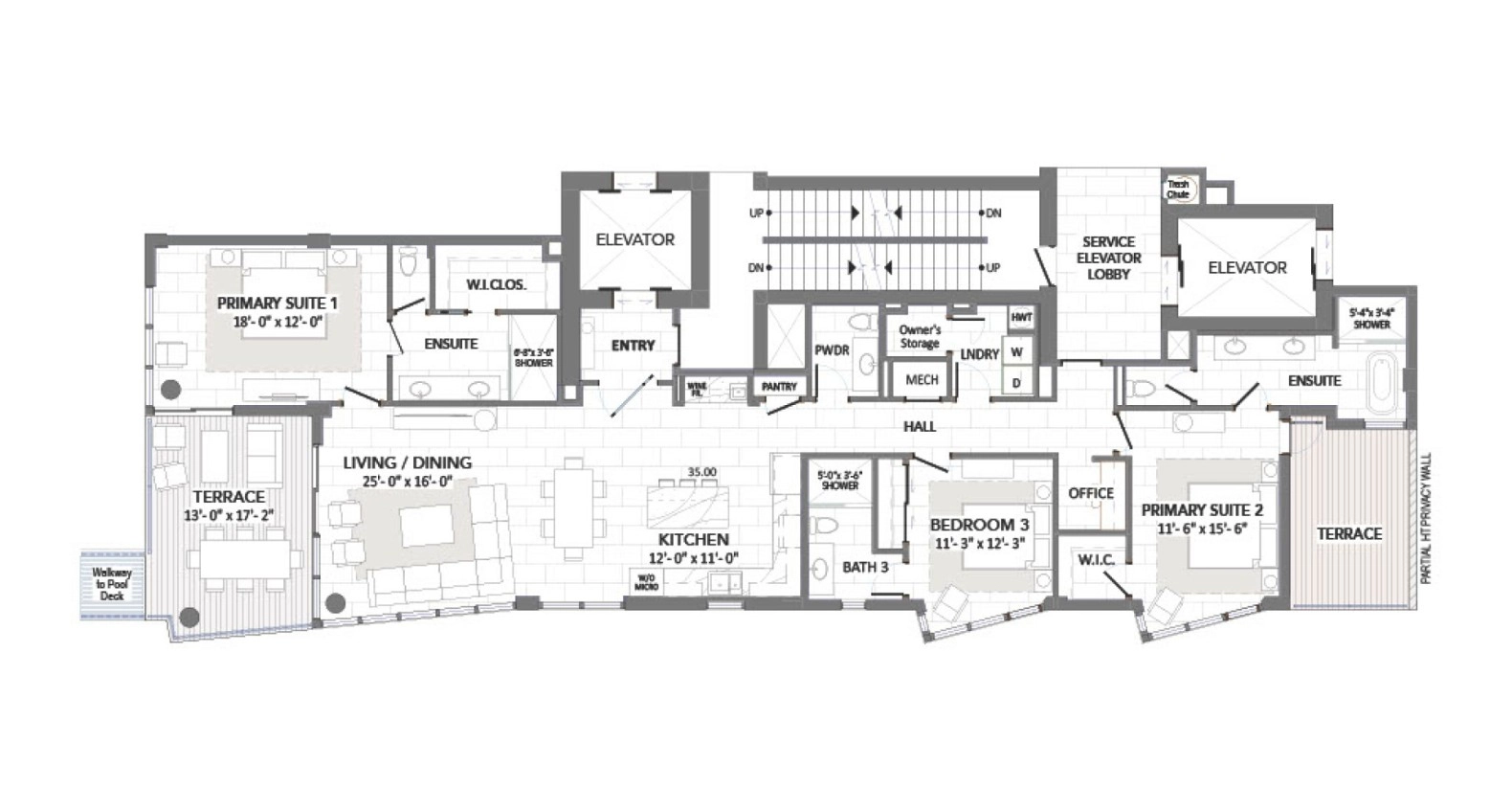 Aqua Bay will offer a daily rental program which owners can utilize while not in residence, making this building the newest and most luxurious daily rental destination in Grand Cayman. With 2715 sq. ft. and featuring 3 bedrooms and 3.5 bathrooms, this villa features an open concept living/dining area and kitchen with wet bar, 2 Primary Bedrooms Suites each with luxurious spa bathrooms - one with access to a large terrace with stunning views of Seven Mile Beach and the other facing North Sound with a terrace to enjoy incredible sunrises and views to Rum Point and Cayman Kai, a powder room, a home office and laundry room. Additionally, by virtue of the central core design, you will enjoy a private elevator entryway to your villa.
