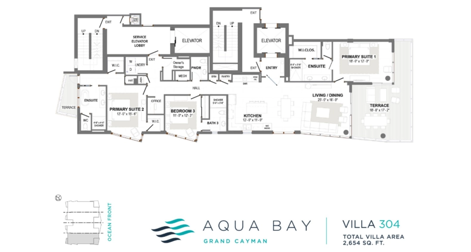 Aqua Bay will offer a daily rental program which owners can utilize while not in residence, making this building the newest and most luxurious daily rental destination in Grand Cayman. With over 2654 sq. ft. and featuring 3 bedrooms and 3.5 bathrooms, this corner villa features an open concept living/dining area and kitchen with wet bar, 2 Primary Bedrooms Suites each with luxurious spa bathrooms - one with access to a large terrace with stunning views of Seven Mile Beach and the other facing North Sound with a terrace to enjoy incredible sunrises and views to Rum Point and Cayman Kai. Additionally, by virtue of the central core design, you will enjoy a private elevator entryway to your villa.