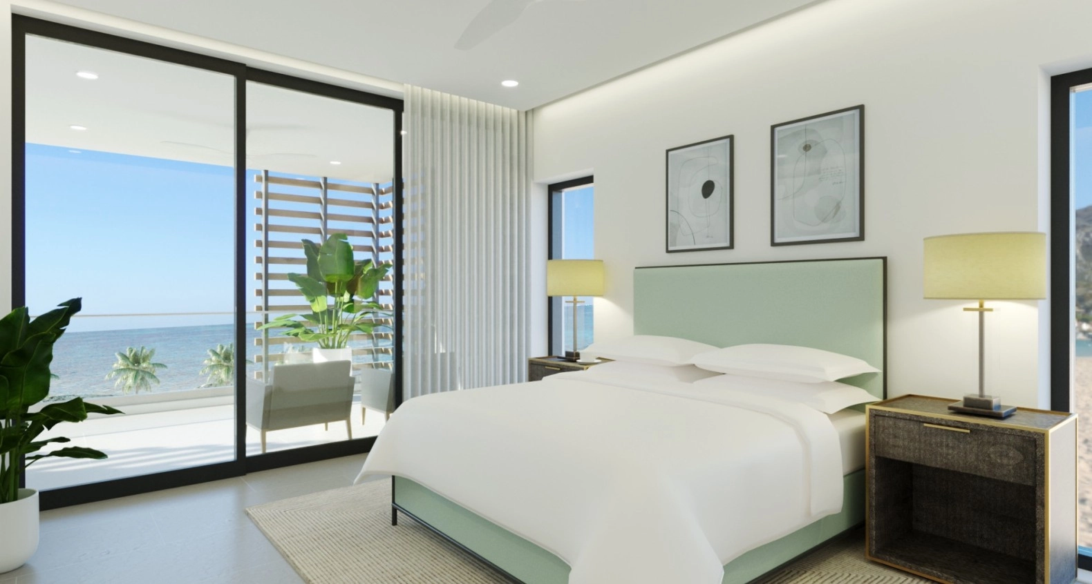 This condo sits some 25 ft above sea level and has two bedrooms, two baths plus a powder room. The Master bedroom and living room have wall to wall, 10 foot windows, with unencumbered views of the sea. Enjoy an enormous 827 square foot terrace that’s elevated over 13 feet above the pool terrace with a large private garden as well as an outdoor kitchen with gas grill. A private staircase from the unit leads down to the main pool and sea pool with neighbors on only one side.