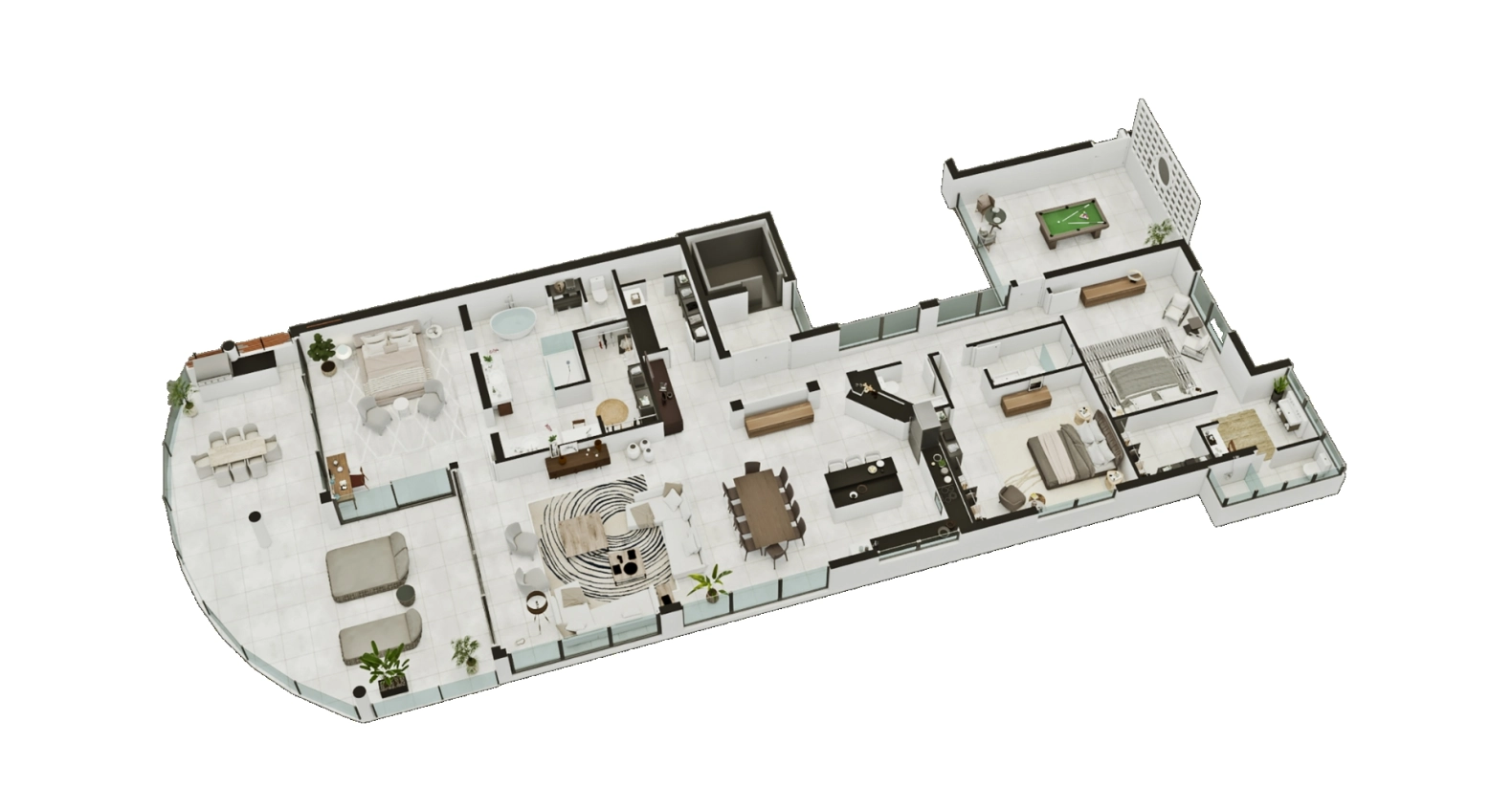 The interior is of impeccable quality, the very best in Cayman. A spectacular Rooftop Lounge that overlooks the Sea and island has been intimately designed for the owner’s enjoyment – wet bar, BBQ, catering kitchen, spa/plunge pool, restroom, and designer furnishings. The fitness facility is a distinctive glass-fronted gym on the Seafront with high-end equipment. The grounds are densely landscaped with lush plants and trees that even feature planted courtyards inside the ultra-modern building, positioned 84 feet back from the road.